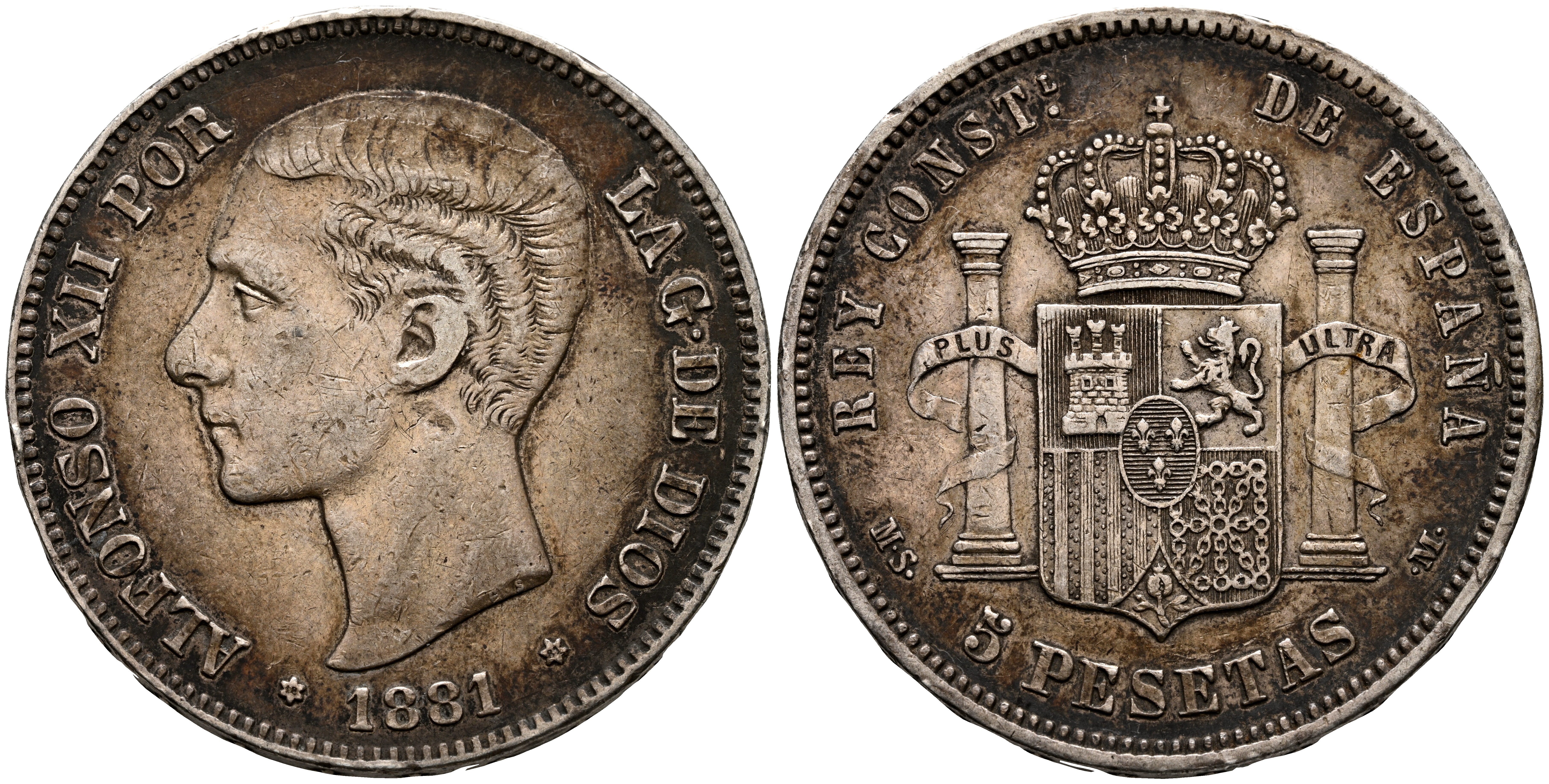 ALFONSO XII (1874-1885). 5 Pesetas. (Ar. 24,94g/37mm). 1881 *18-81. Madrid MSM. (Cal-2019-44). MBC. Bonito tono.