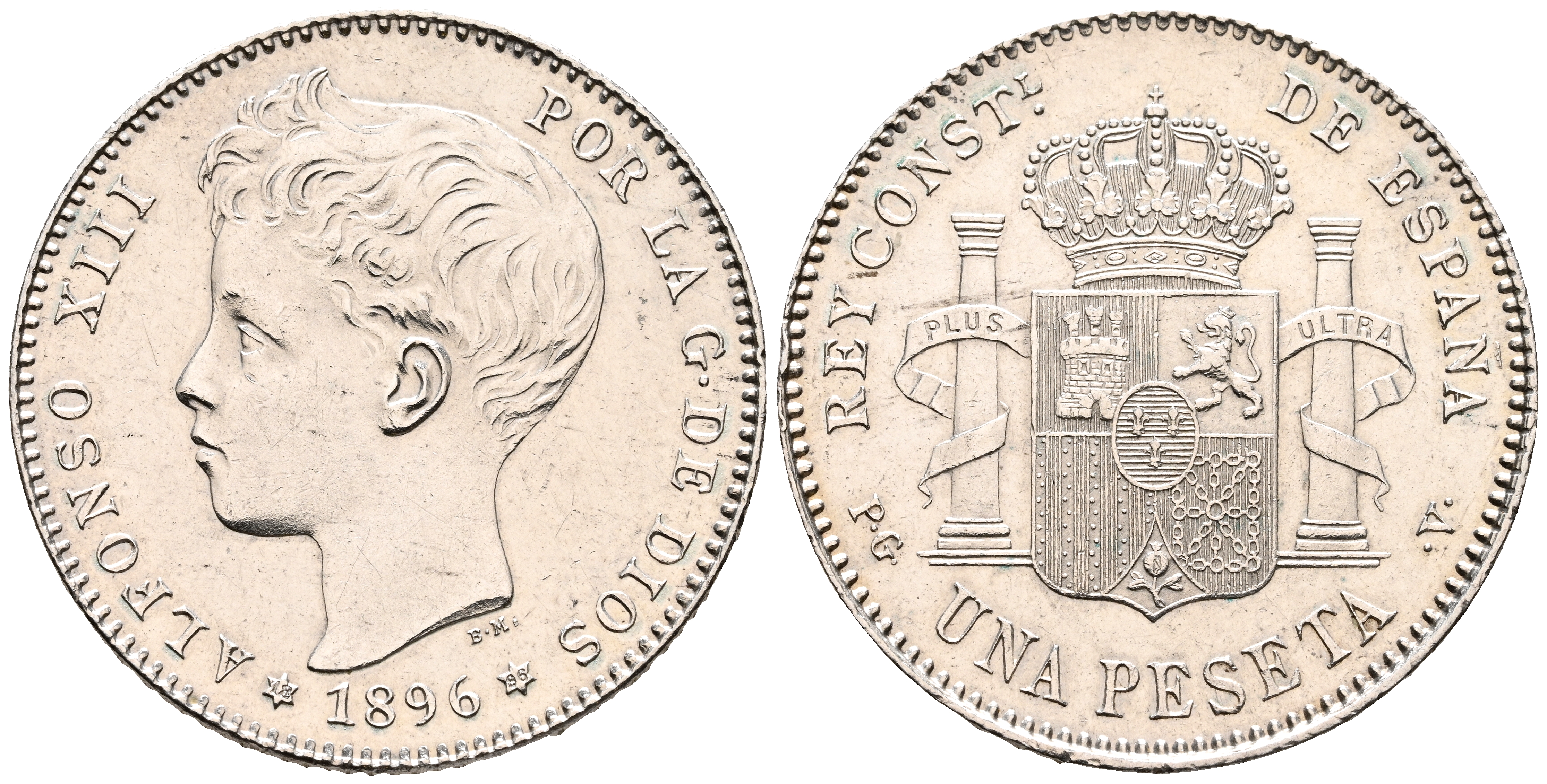 ALFONSO XIII (1885-1931). 1 Peseta. (Ar. 4,94g/23mm). 1896 *18-96. Madrid PGV. (Cal-2019-56). EBC. Limpiada. Restos de brillo original.