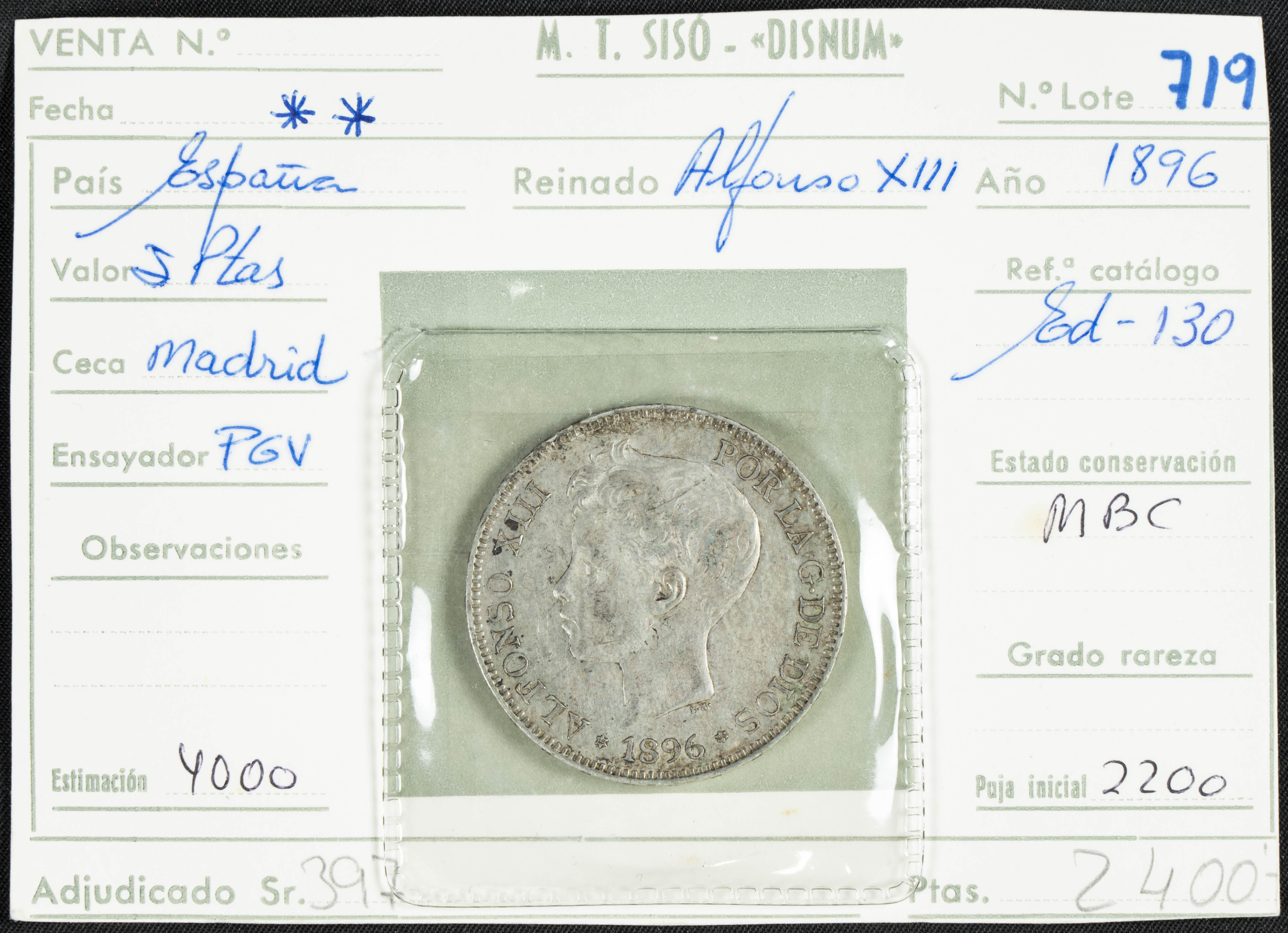 ALFONSO XIII (1885-1931). 5 Pesetas. (Ar. 25,09g /37mm). 1896 *18-96. Madrid PGV. (Cal-2019-106). MBC. Incluye ficha original de M. T. Sisó Disnum.
