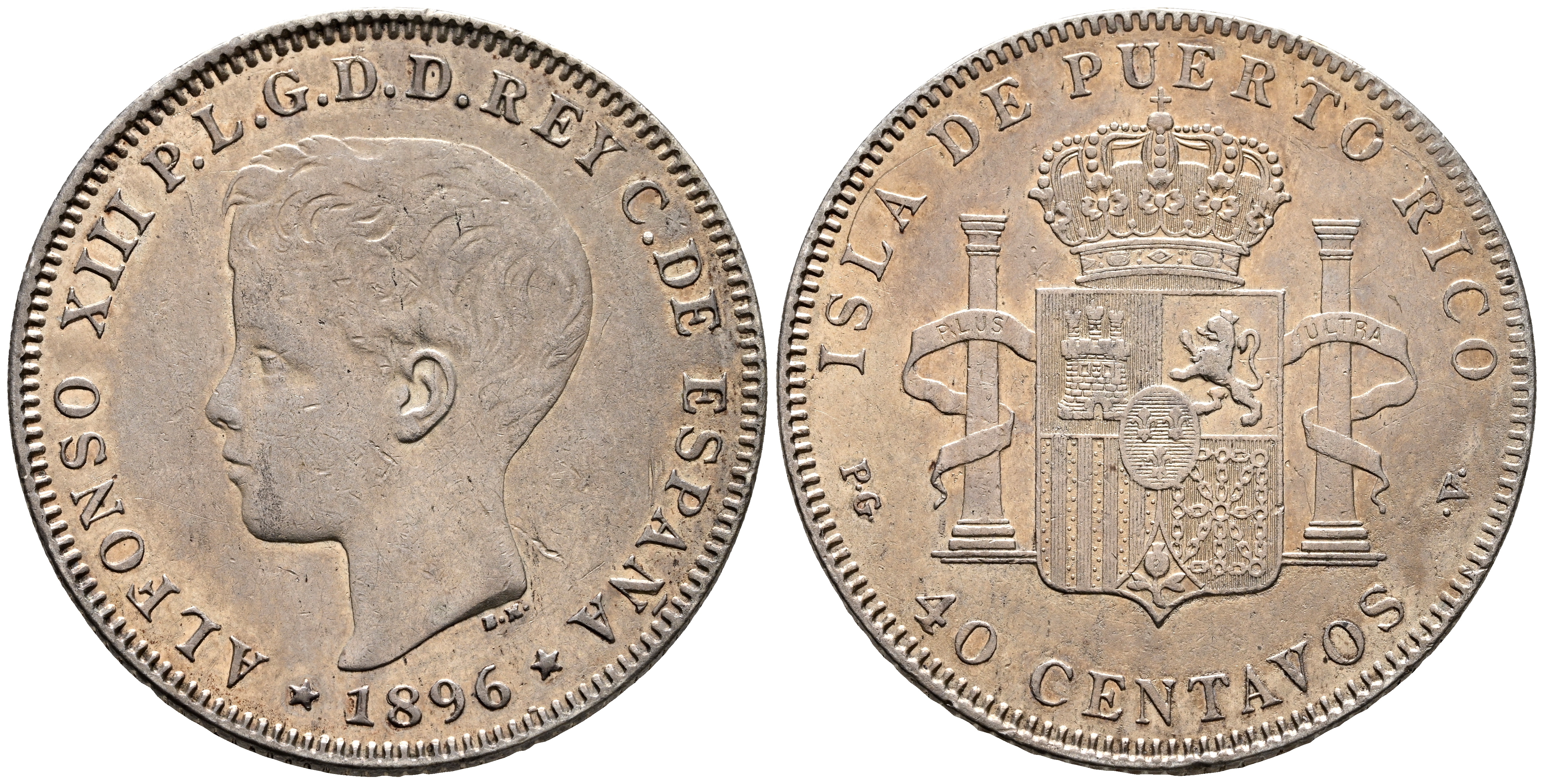 ALFONSO XIII (1885-1931). 40 Centavos. (Ar. 9,88g/27mm). 1896. Puerto Rico PGV. (Cal-2019-127). MBC+. Restos de brillo original. Interesante ejemplar.