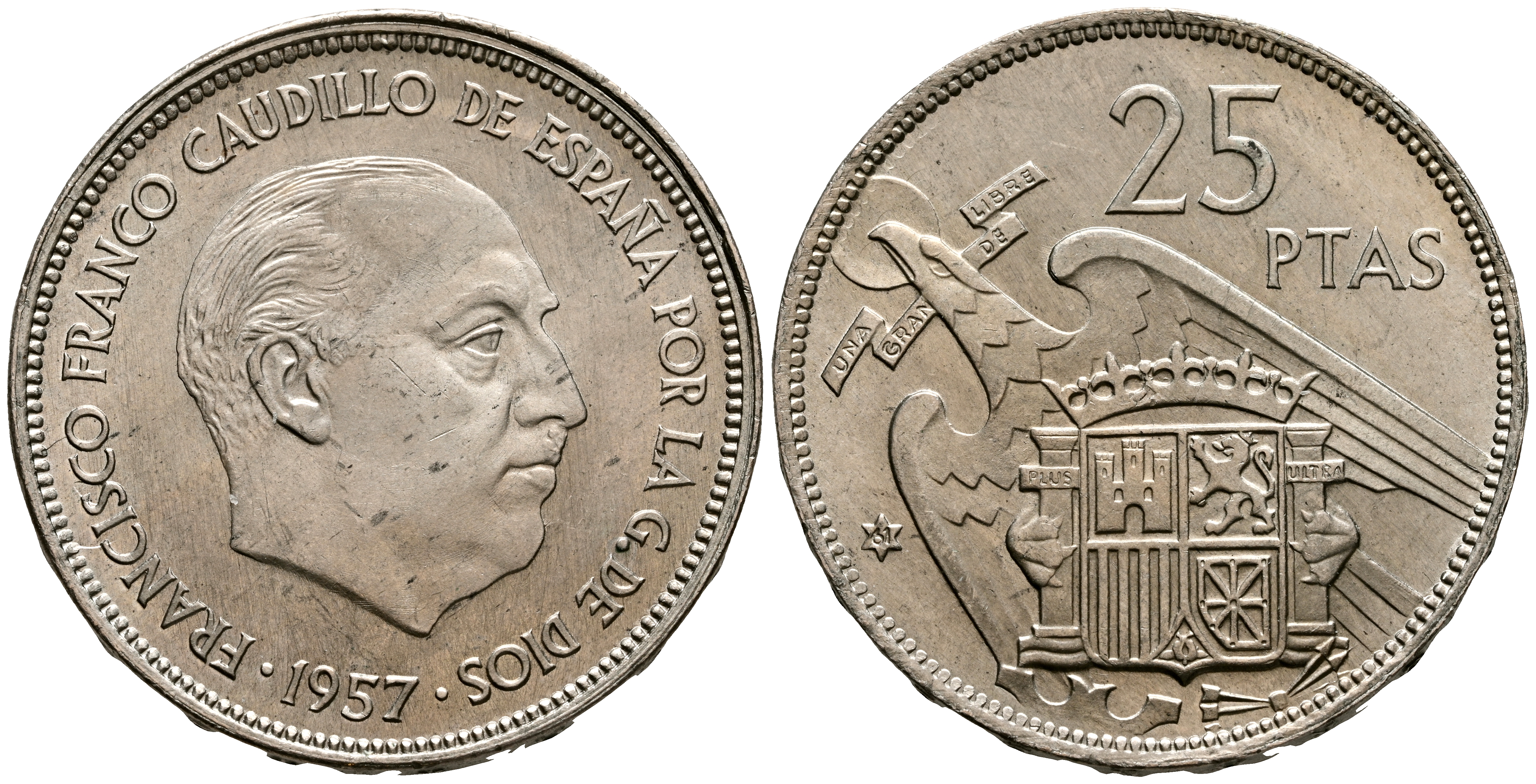 ESTADO ESPAÑOL (1936-1975). 25 Pesetas. (Ni. 8,74g/27mm). 1957 *61. Madrid. (Cal-2019-118). EBC+. Escasa.