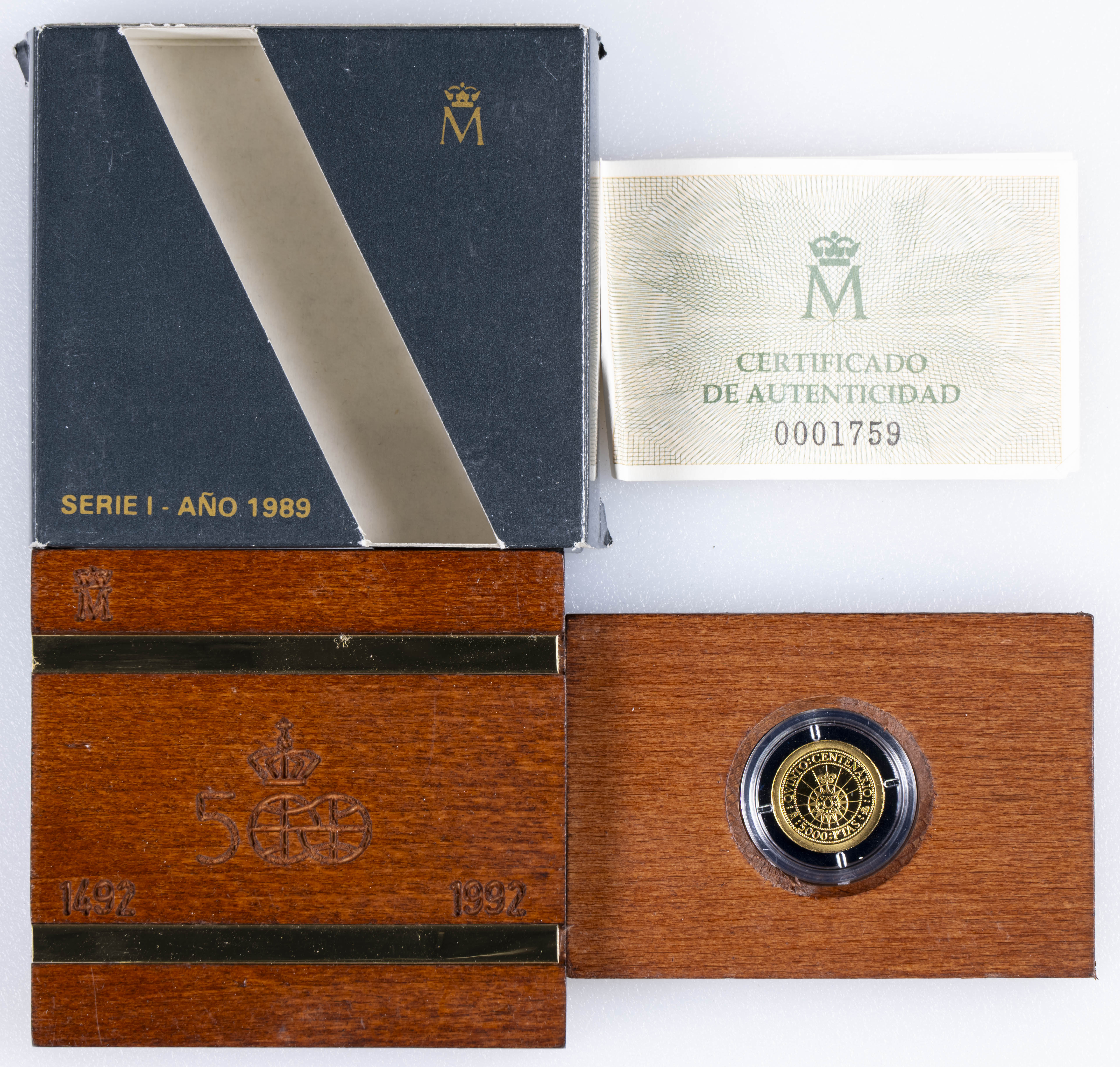 JUAN CARLOS I (1975-2014). 5.000 Pesetas. (Au. 1,68g/15mm). Quinto Centenario. Serie I. 1989. FNMT. PROOF. Presentada en estuche oficial y con certificado de autenticidad.