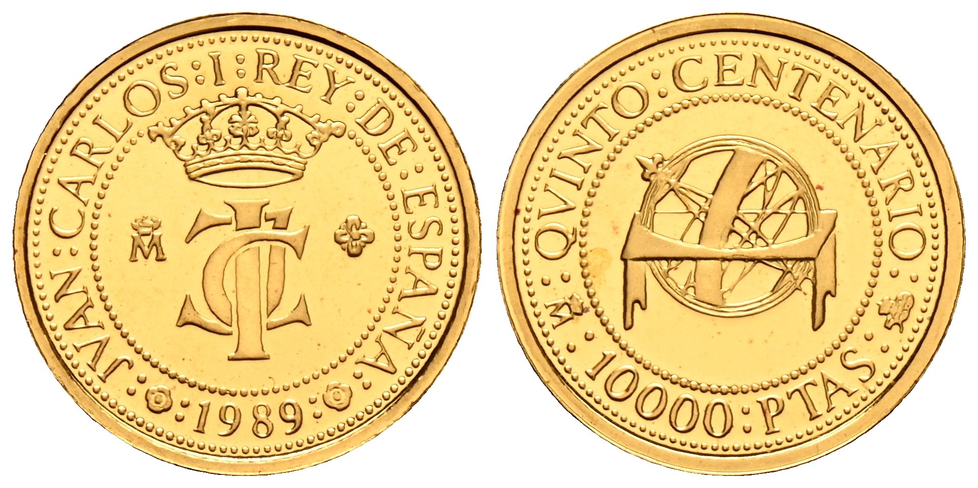 JUAN CARLOS I (1975-2014). 10.000 Pesetas. (Au. 3,37g/19mm). Quinto Centenario. Serie I. 1989. FNMT. PROOF. Presentada en estuche oficial y con certificado de autenticidad.