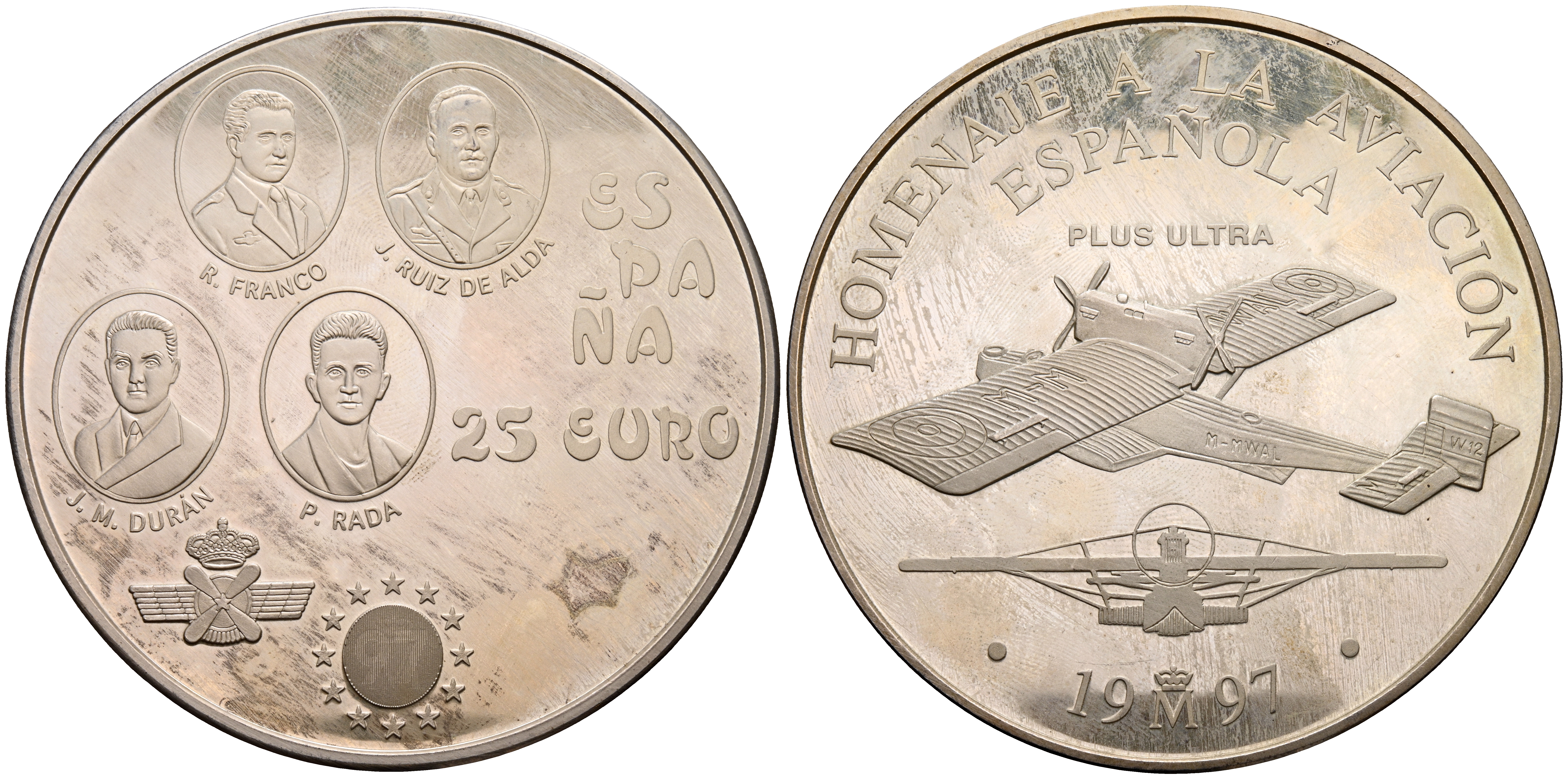 JUAN CARLOS I (1975-2014). 25 Euro. (Ar. 168,26g/73mm). Serie Aviación Española. Plus Ultra. 1997. FNMT. SC. Rayitas.