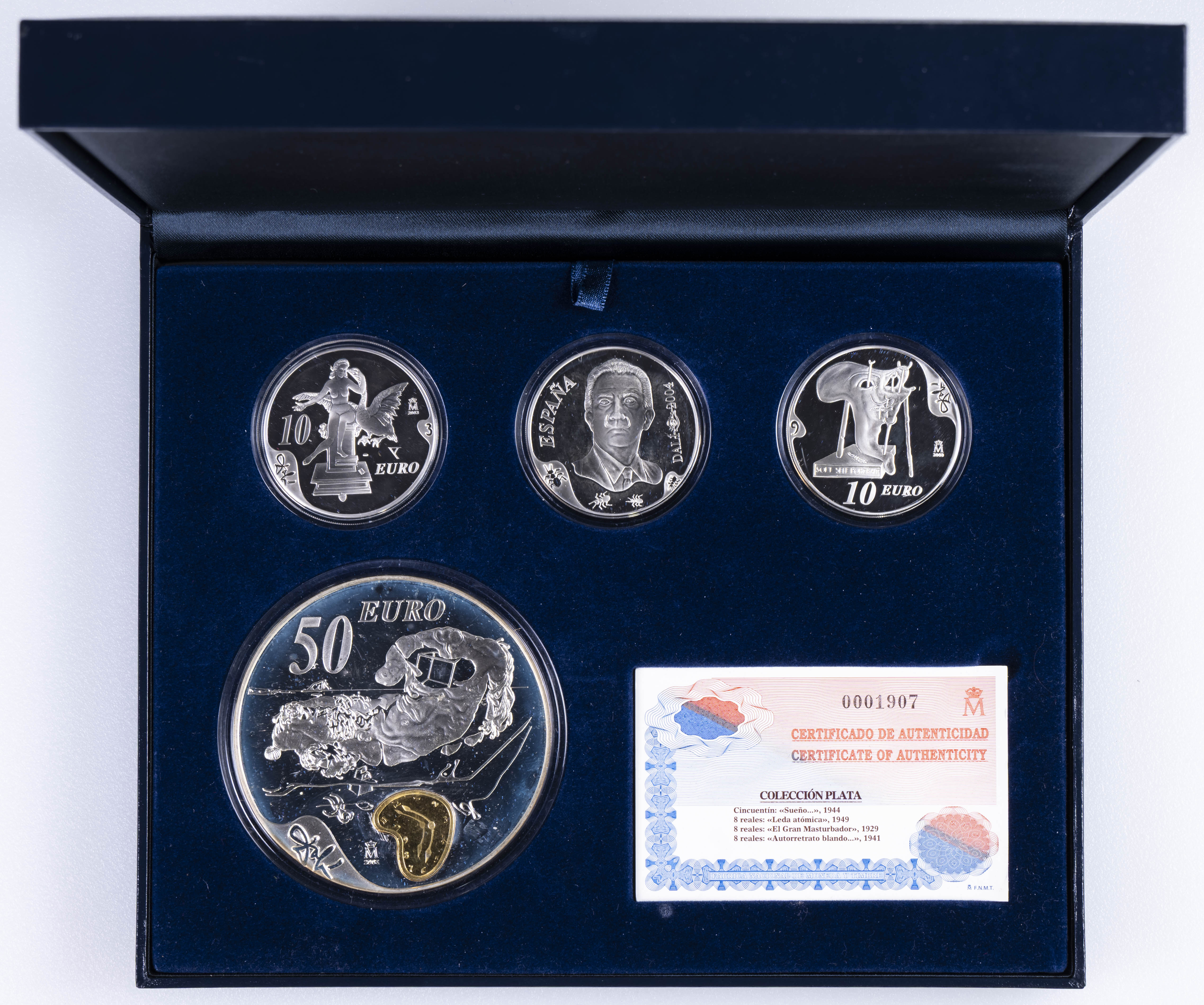 JUAN CARLOS I (1975-2004). Centenario del nacimiento de Salvador Dalí. 2004. FNMT. Estuche original formado por 4 piezas de valores de 10 Euros (3) y 50 Euro (1). PROOF. Estuche completo incluyendo certificado de autenticidad.