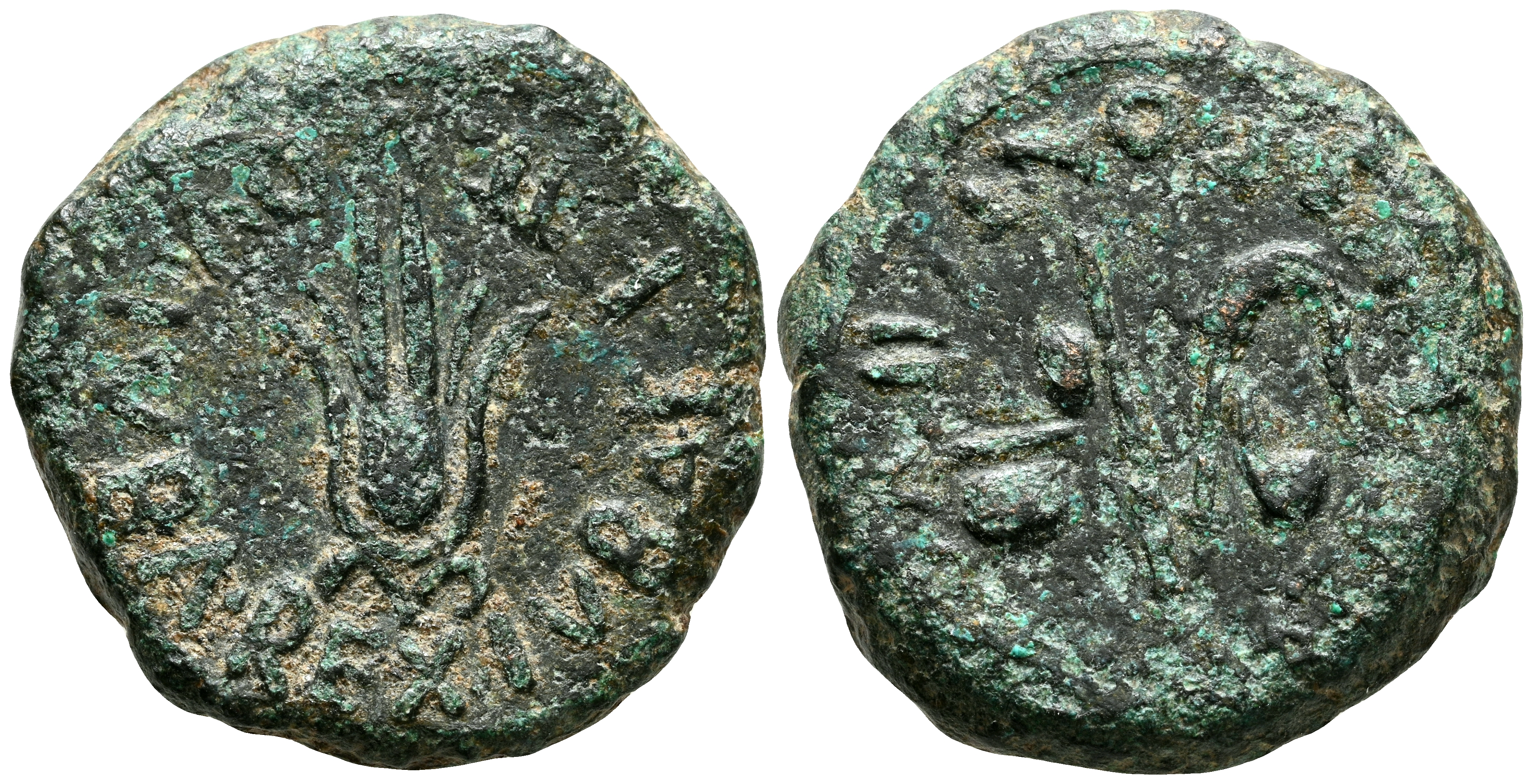 CARTAGONOVA (Cartagena, Murcia). Semis. (Ae. 7,12g/20mm). 27 a.C.-14 d.C. (FAB-585). Anv: Flor de loto, alrededor leyenda: IVBA REX IVBAE F II VIR QV. Rev: Atributos sacerdotales, alrededor leyenda: CN ATELIVS PONTI II V Q. MBC-.