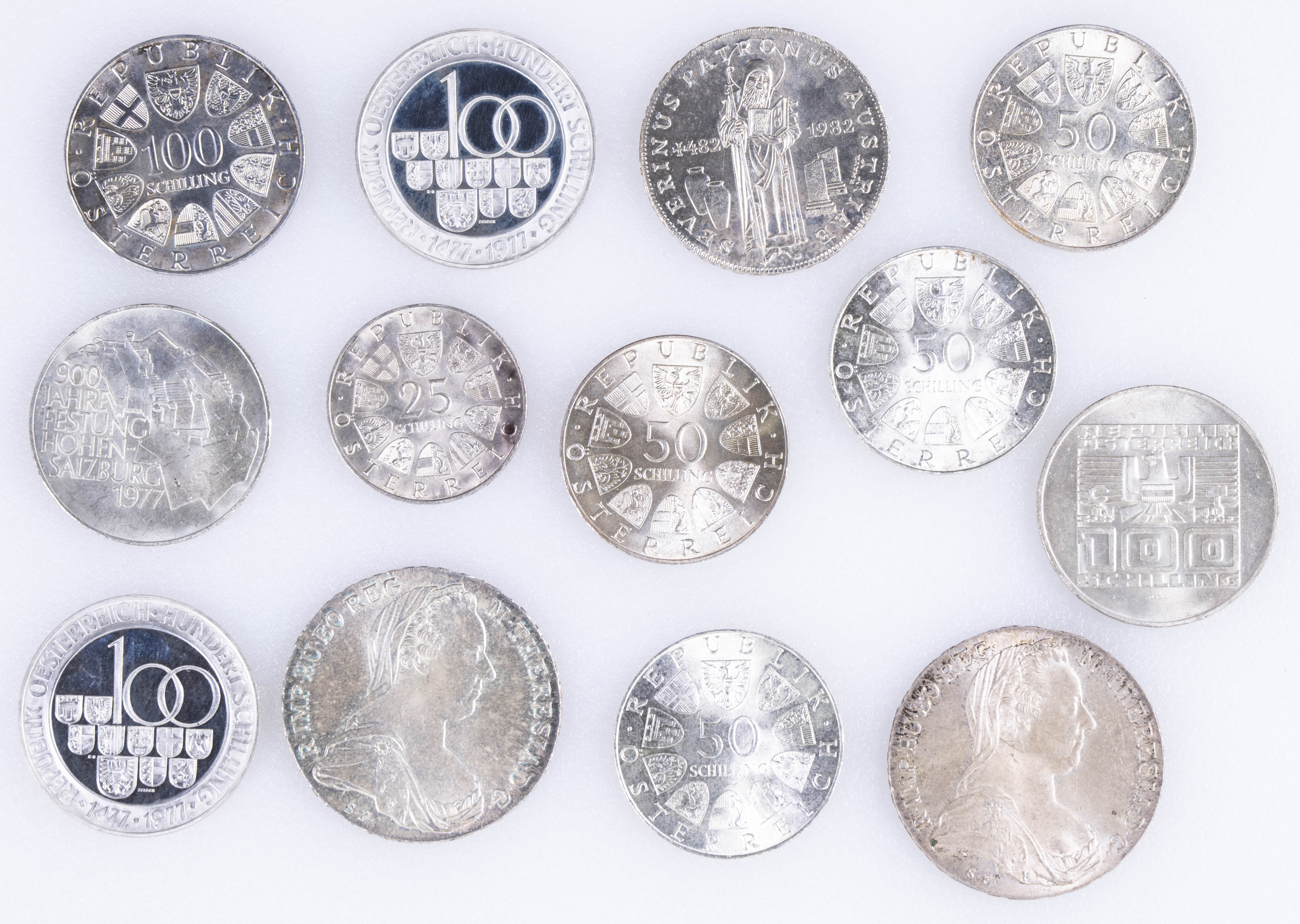 AUSTRIA. Conjunto de 13 monedas de plata compuesto por módulos de 25, 50, 100 y 500 Shilling. Incluye 2 Thaler de 1780 (reproducción moderna). Excelente conservación general. A EXAMINAR.