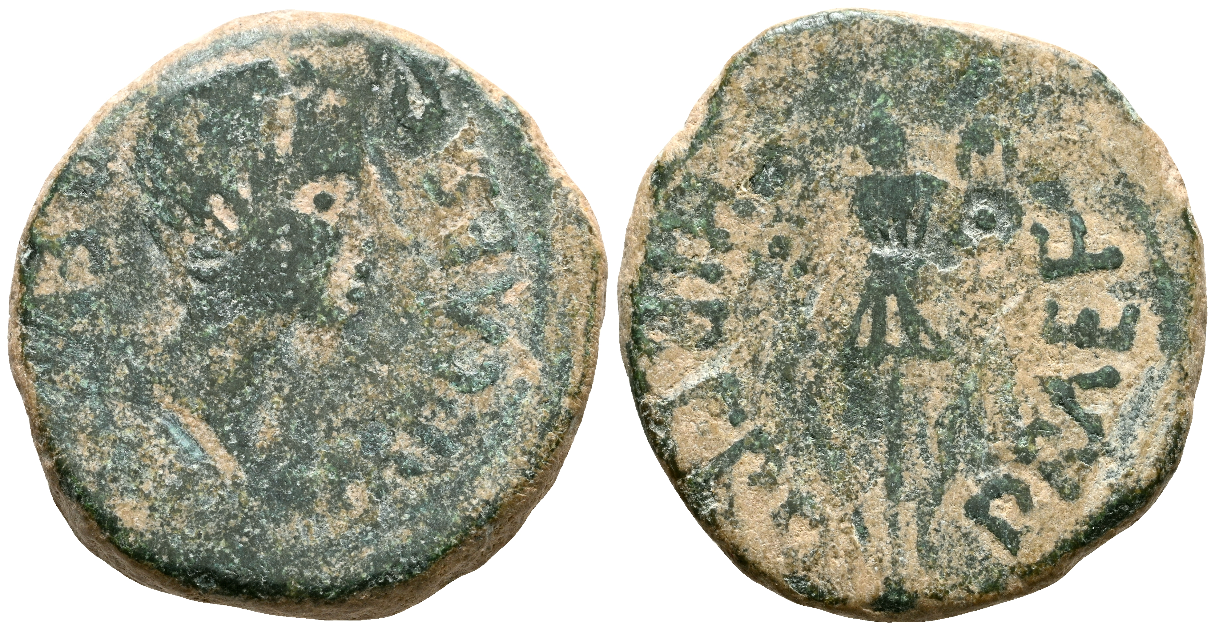 CARTAGONOVA (Cartagena, Murcia). Semis. (Ae. 5,23g/21mm). 27 a.C.-14 d.C. (FAB-588 var). Anv: Cabeza de ¿Agripa? a derecha, alrededor leyenda: L BEN PRAE IMP CAES QVIN. Rev: Trofeo sobre lanzas, alrededor leyenda: HIBERO PRAEF. BC+.