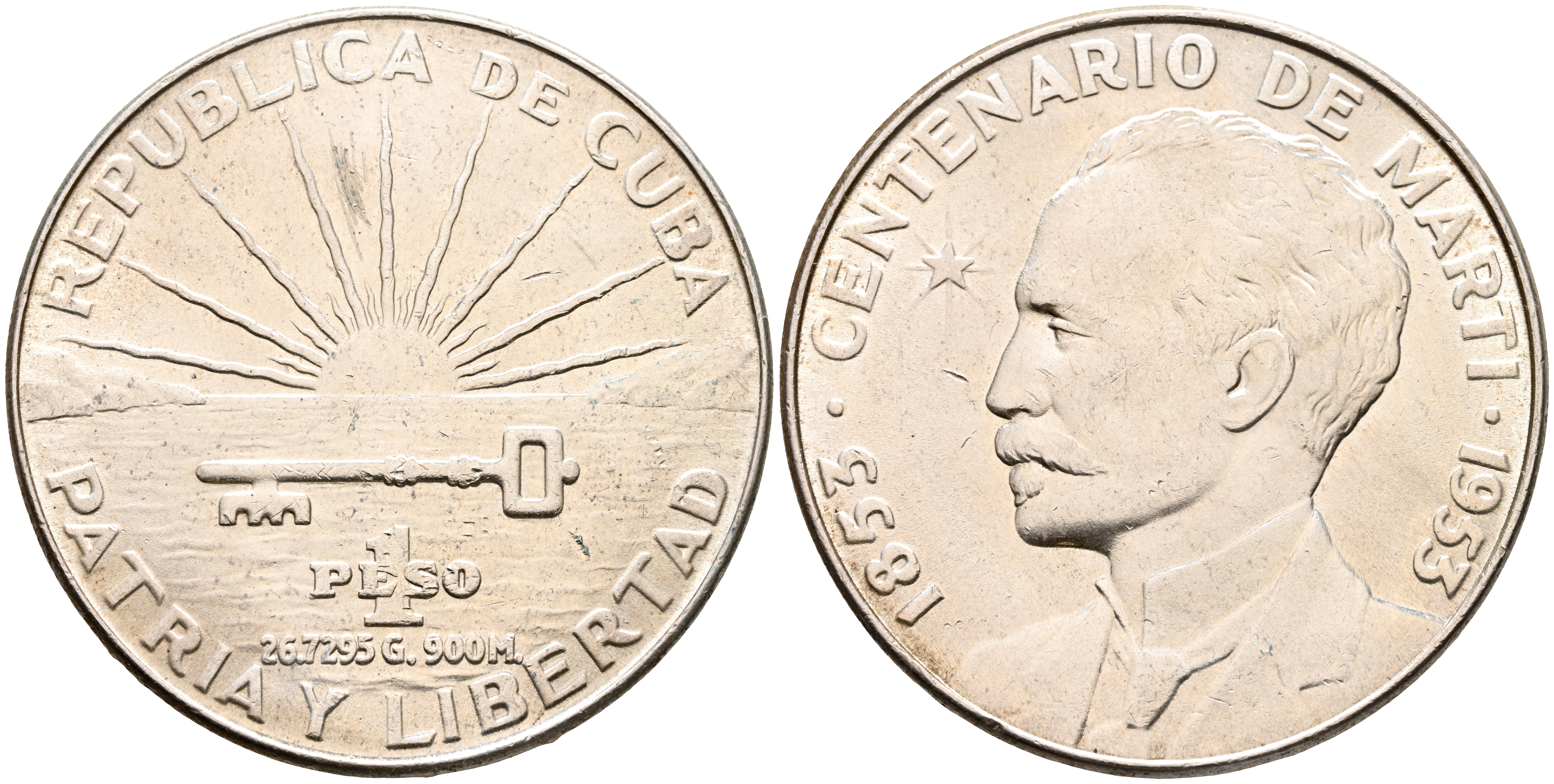 CUBA. 1 Peso. (Ar. 26,74g/38mm). 1953. Centenario del Nacimiento de José Martí (1853-1953). (Km#29). EBC-. Marquitas en anverso.