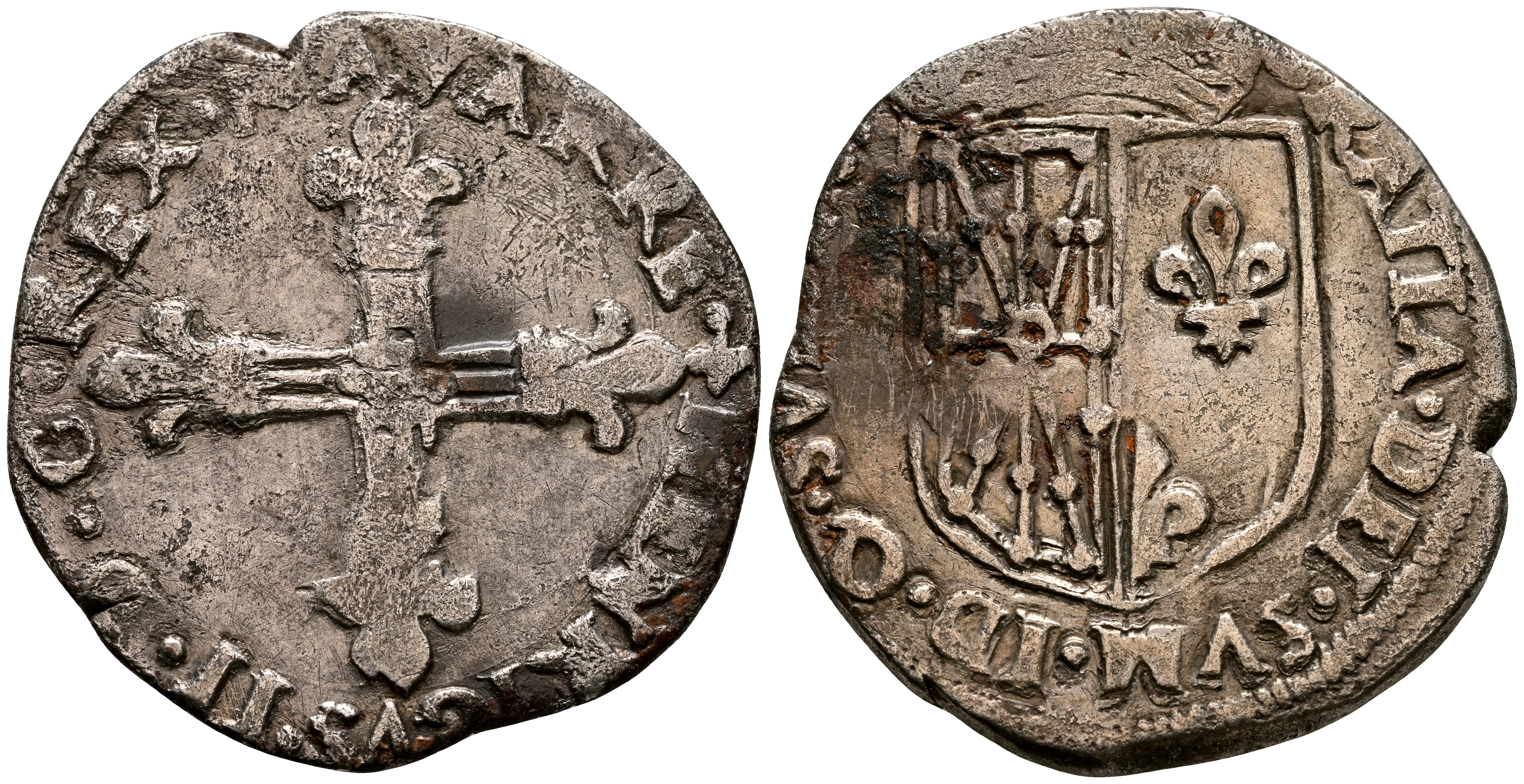 FRANCIA, Henri III (1574-1589). 1/4 Ecu de Navarra (Ar. 9,13g/28mm). 1586. Saint Palais. (Duplessy 1402). MBC. Tono de monetario. Oxidaciones. Escasa.