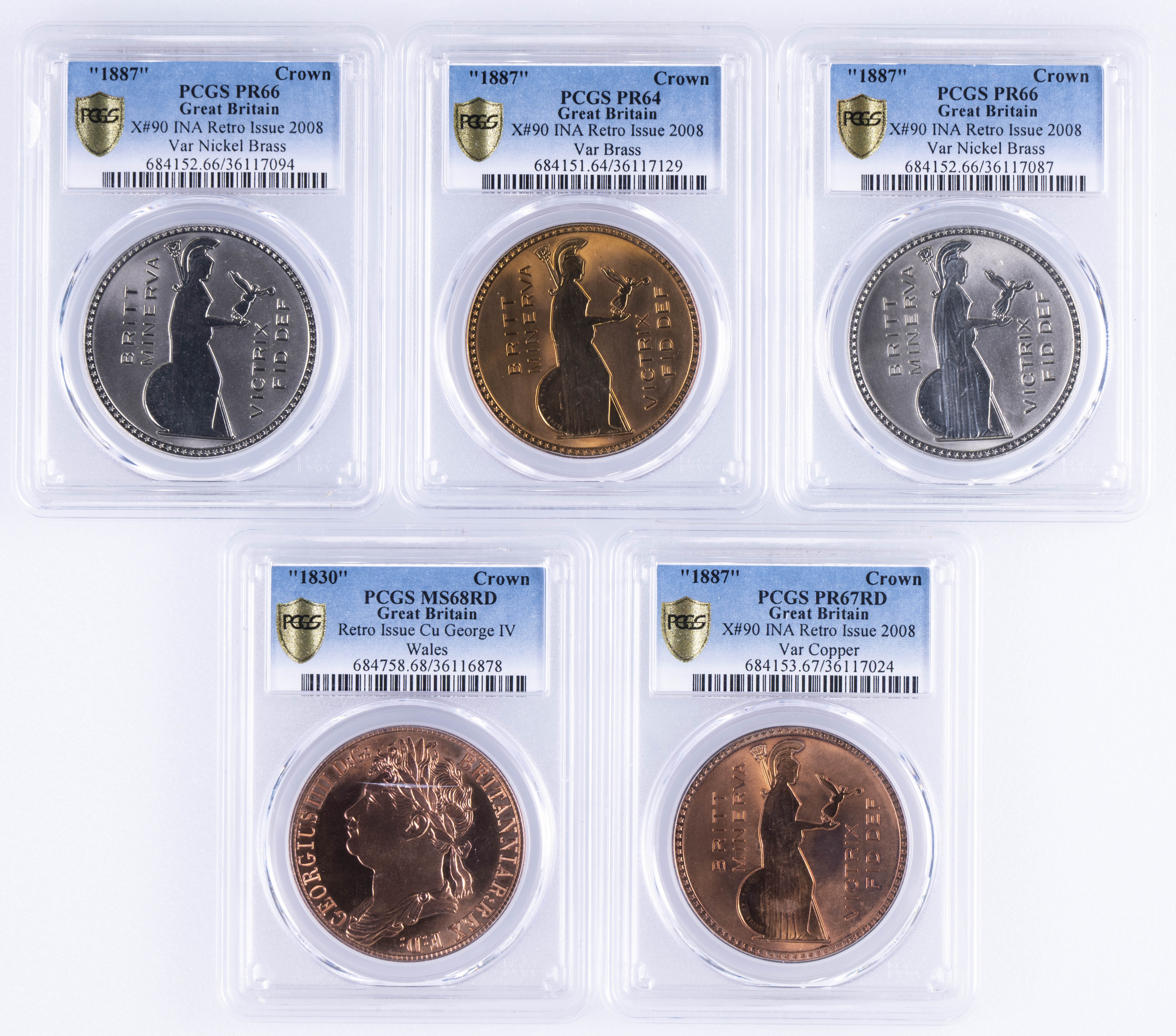 GRAN BRETAÑA. Conjunto de 5 reacuñaciones modernas de Coronas británicas de 1830 y 1887 (2008). Solo una pieza repetida con variedas de materiales de acuñación (níquel, latón y cobre). Todas las monedas están encapsuladas por PCGS con diferentes graduaciones entre PR64 y MS68. A EXAMINAR.