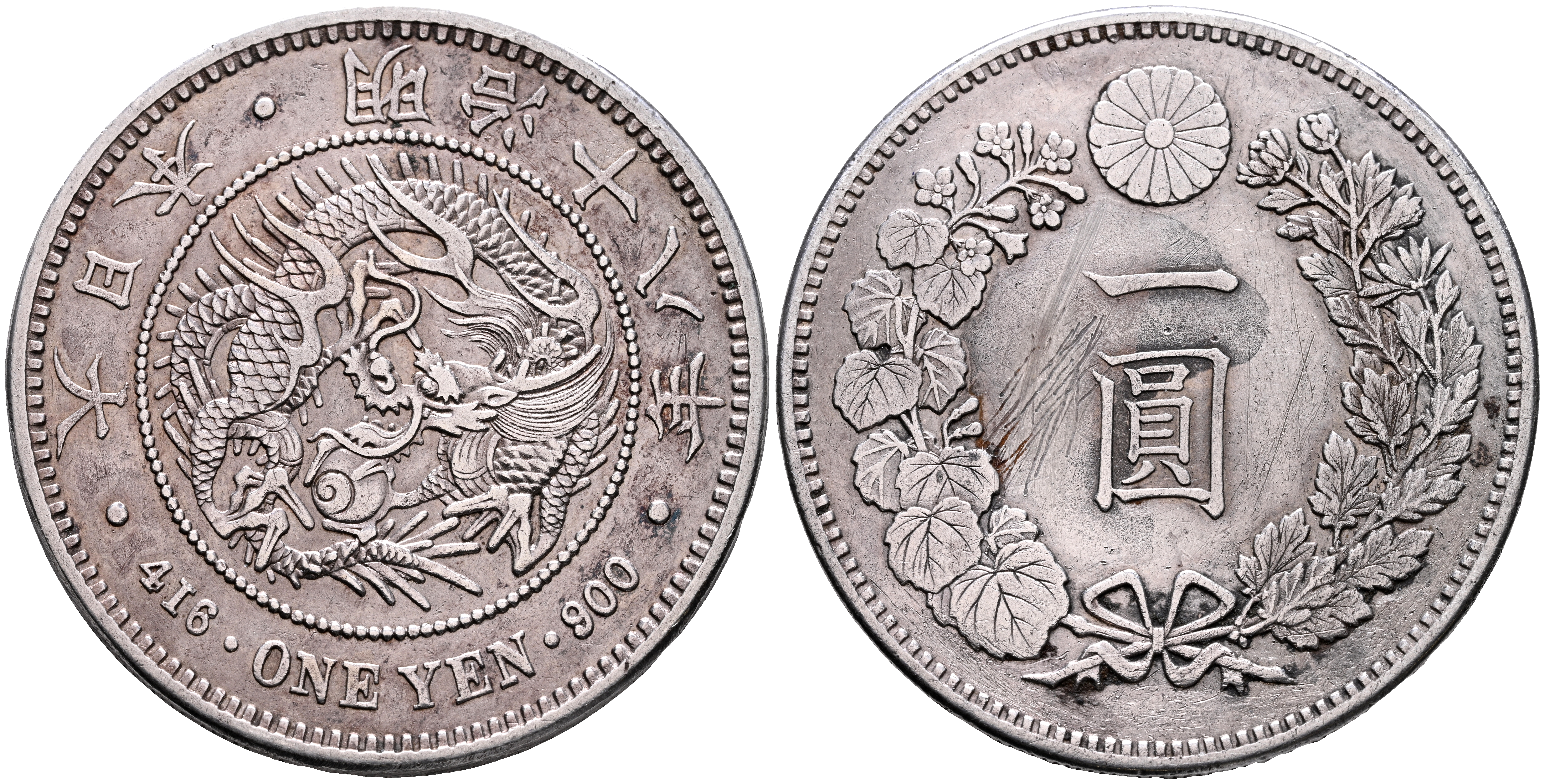 JAPÓN. 1 Yen. (Ar. 27,01g/38mm). 1885 (Año 18). Mutsuhito, Osaka. (Km#25a.2). MBC+/MBC-. Rayas en reverso.