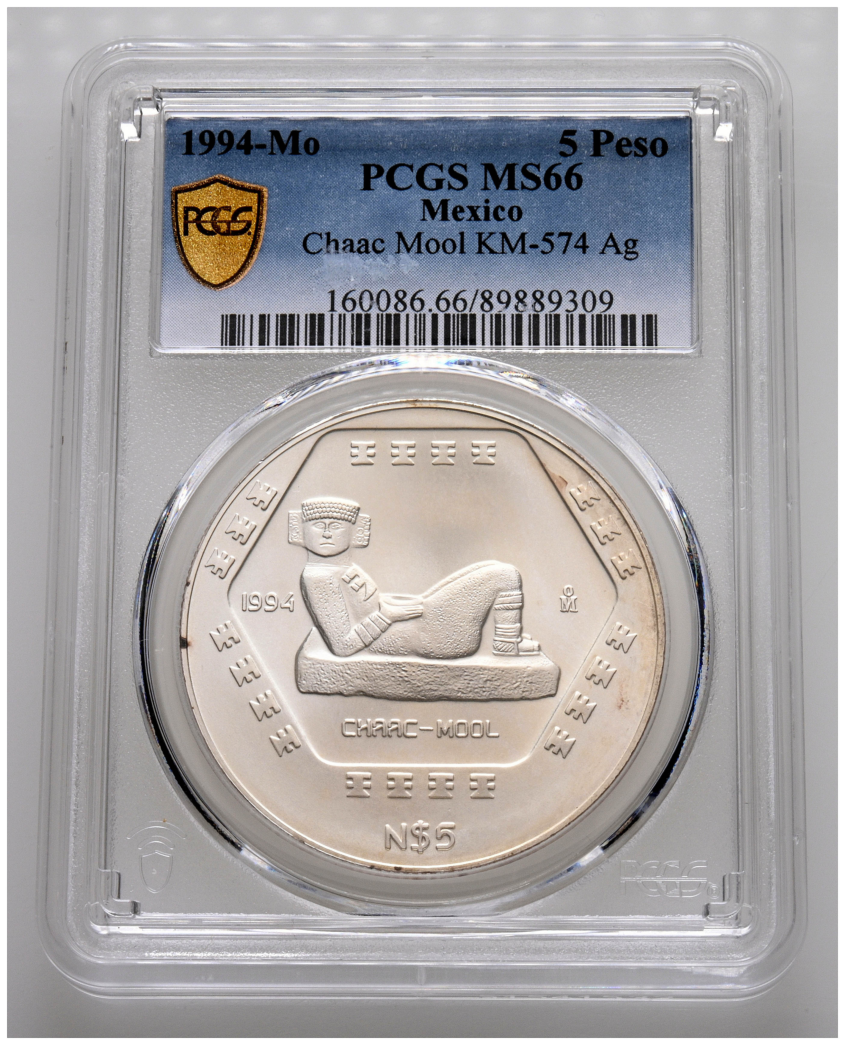 MÉXICO. 5 Pesos. (Ar. 31,10g/40mm)*. 1994. Cultura pre-colombina: Chaac Mool. (Km#574). Encapsulado por PCGS MS 66. *Peso y medidas teóricos.