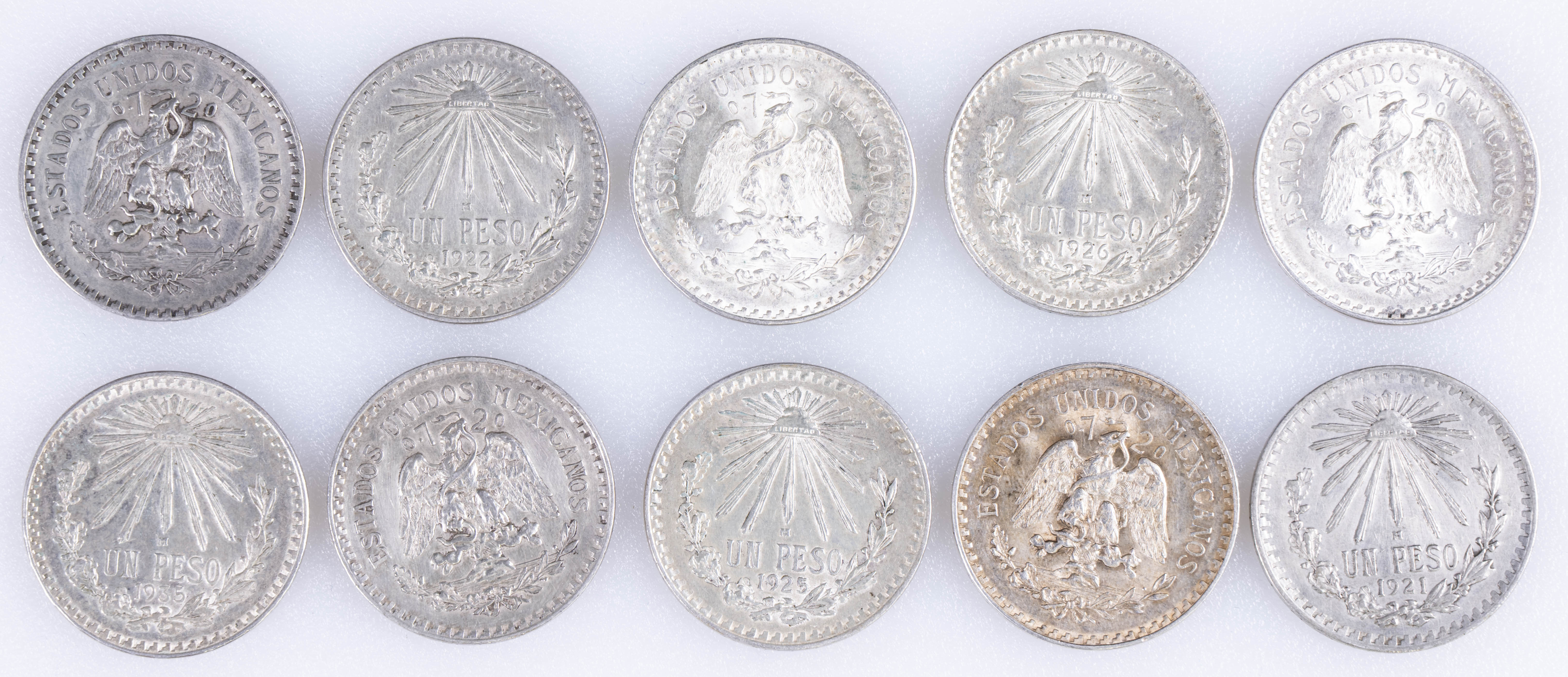 MÉXICO. Conjunto de 10 monedas de plata de 1 Peso, sin repeticiones, con fechas comprendidas entre 1927 y 1944. Diferentes estados de conservación. A EXAMINAR.