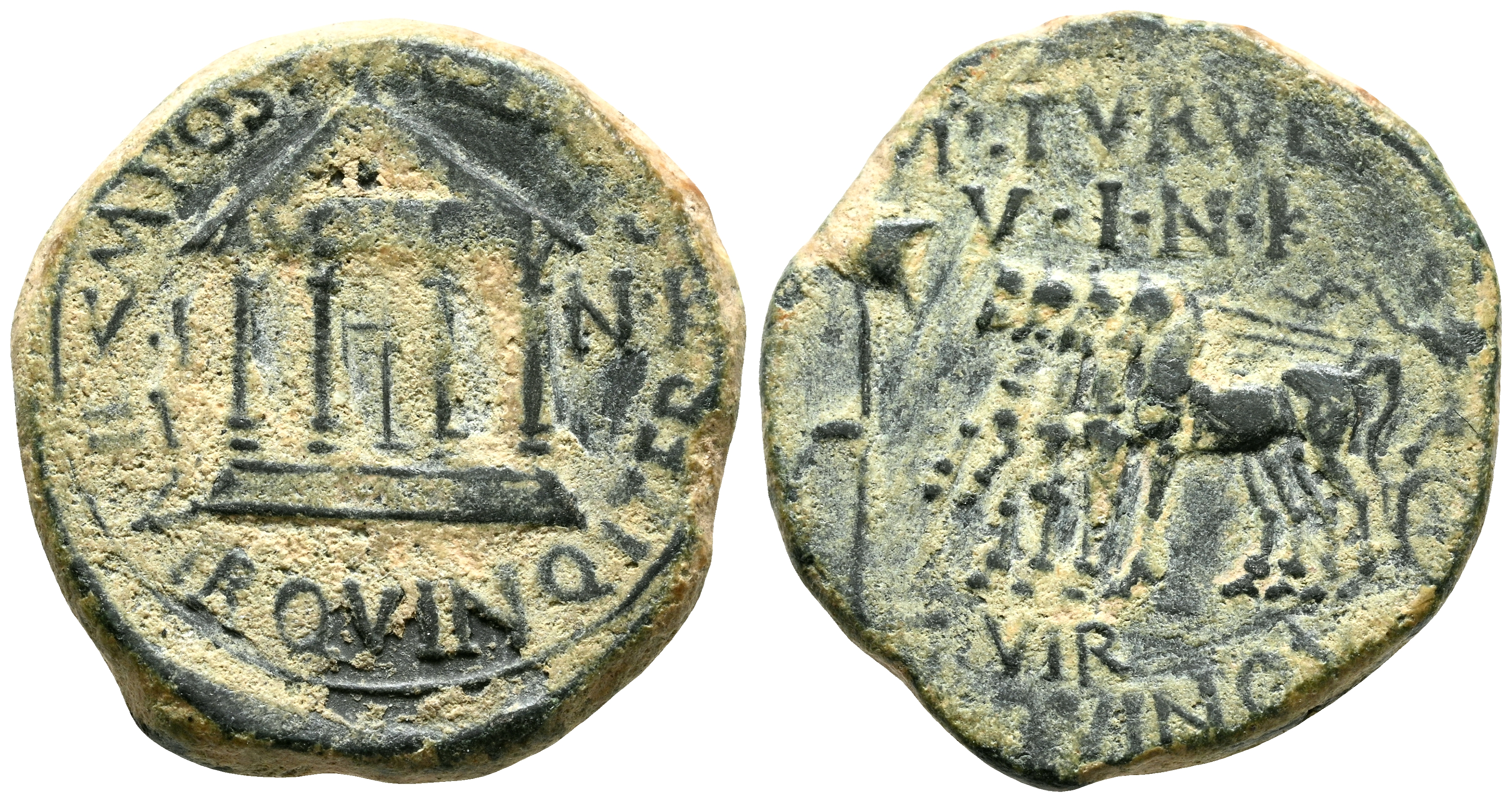 CARTAGONOVA (Cartagena, Murcia). Semis. (Ae. 4,80g/19mm). 14-36 d.C. (FAB-602). Anv: Templo tetrástilo con inscripción: AVGVSTO, entre: VI-NK, alrededor leyenda: M POSTV ALBINVS II VIR QVINQ ITER. Rev: Cuádriga a izquierda, delante vexilo, alrededor leyenda: P TVRVLLI VINK II VIR QVINQ ITER. MBC.