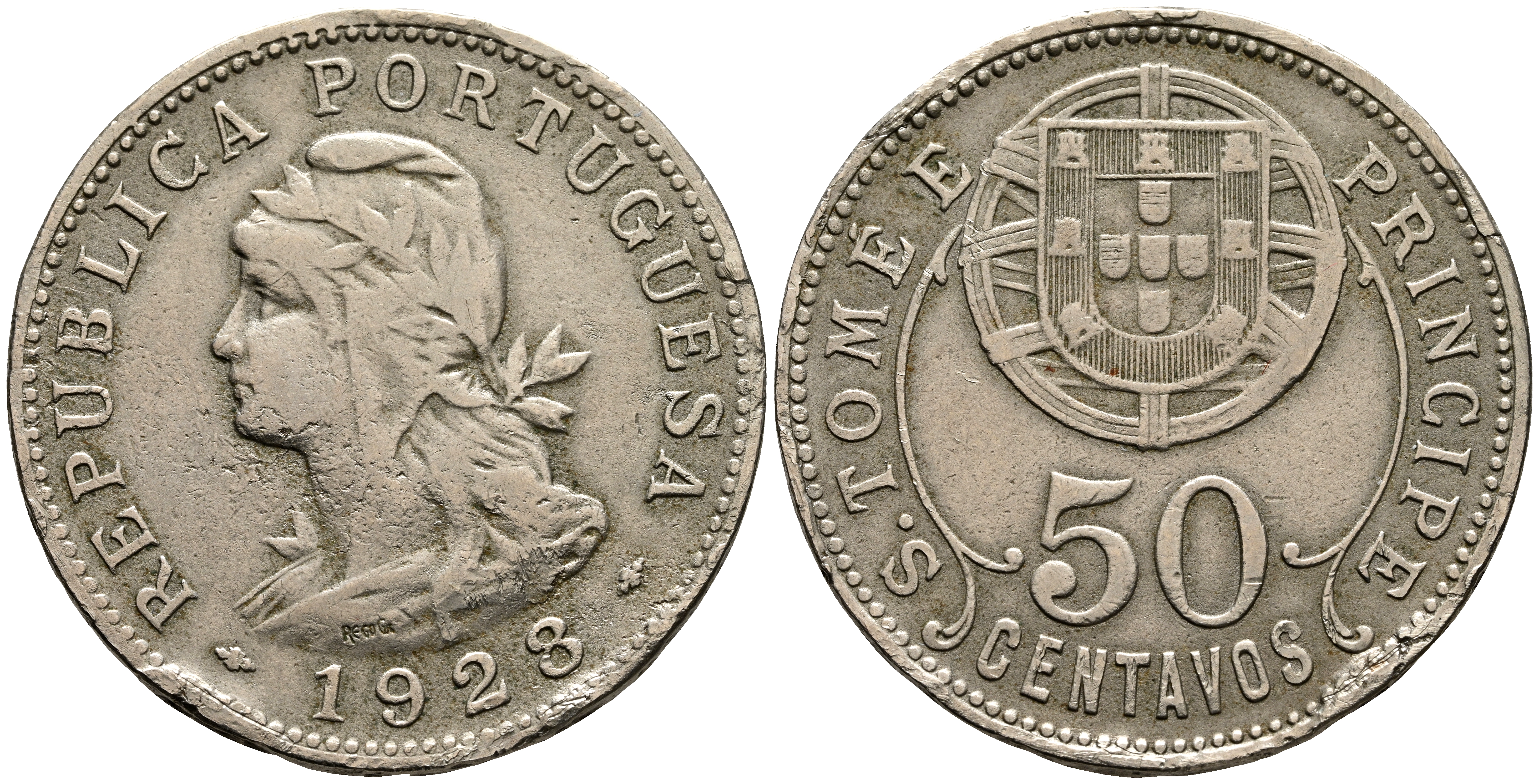 SANTO TOMÉ Y PRÍNCIPE (Portugués). 50 Centavos. (Alpaca.10,18g/30mm). 1928. (Km#1). BC+. Escasa.