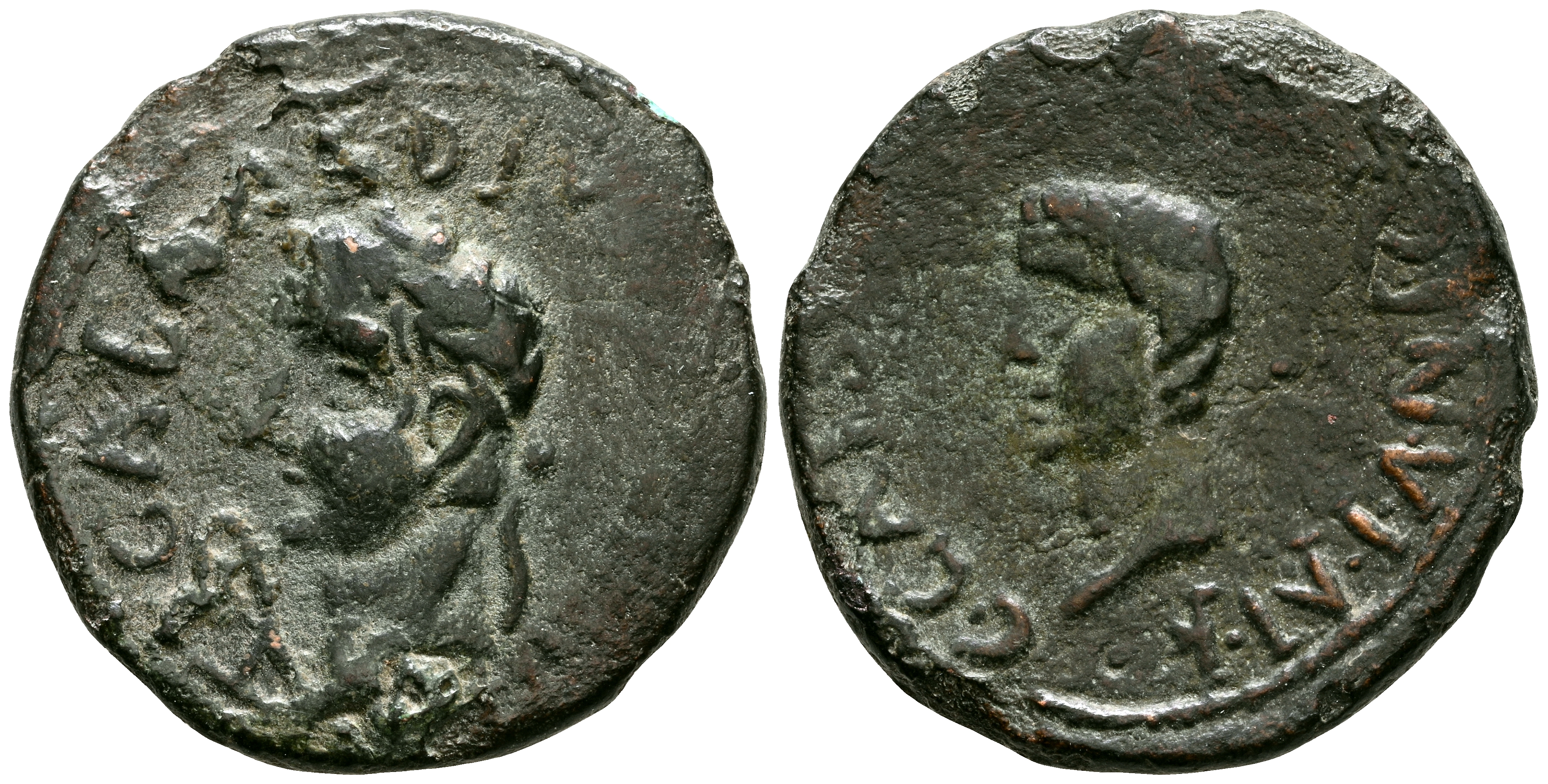 CARTAGONOVA (Cartagena, Murcia). Semis. (Ae. 5,31g/20mm). 14-36 d.C. (FAB-608). Anv: Cabeza de Tiberio a izquierda, delante lítuo, alrededor leyenda: TI CAES DIVI AVG F AVG P M R. Rev: Cabeza de Calígula a izquierda, alrededor leyenda: C CAES TI N QVIQ I N I N K. MBC-. Escaso ejemplar.