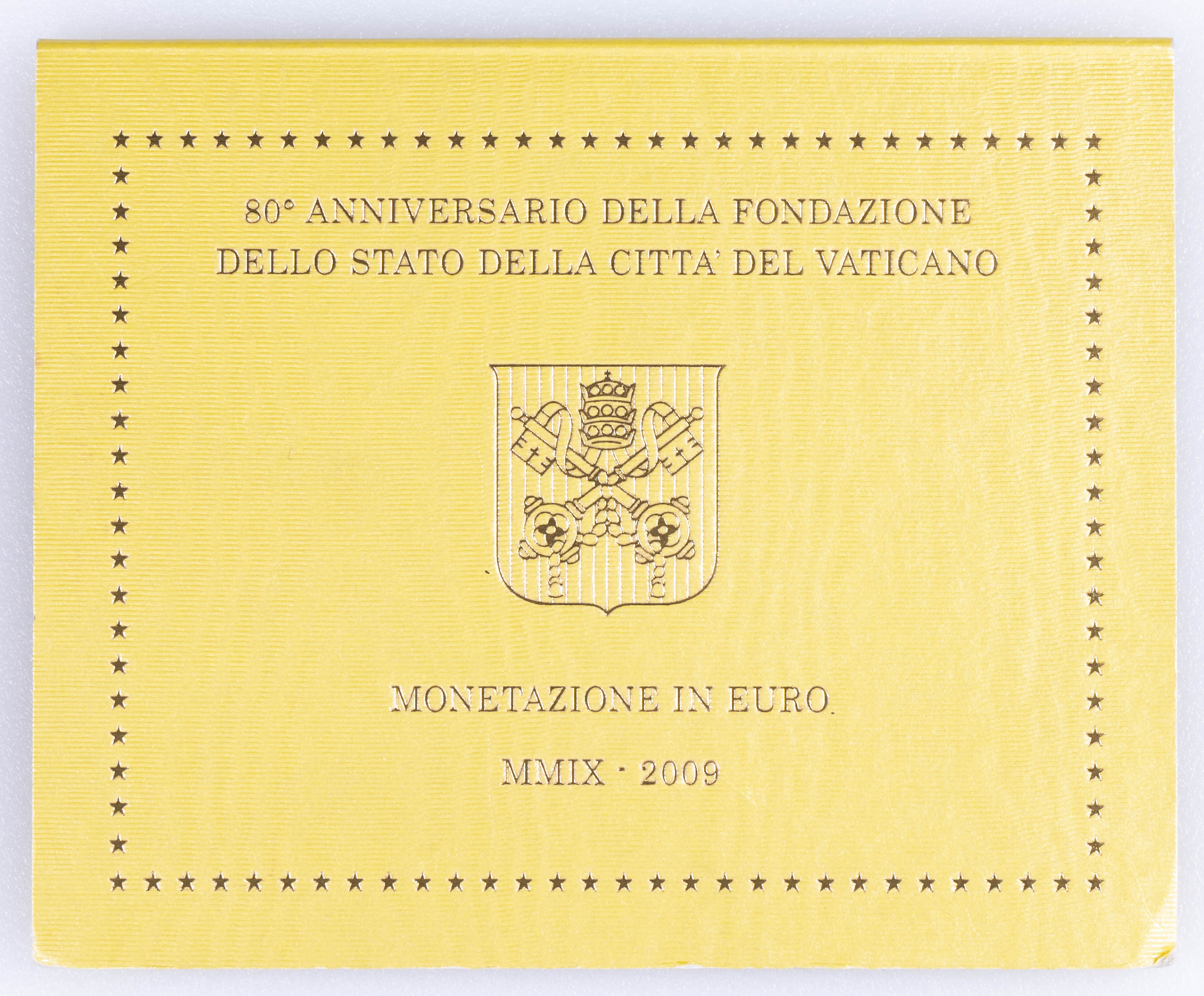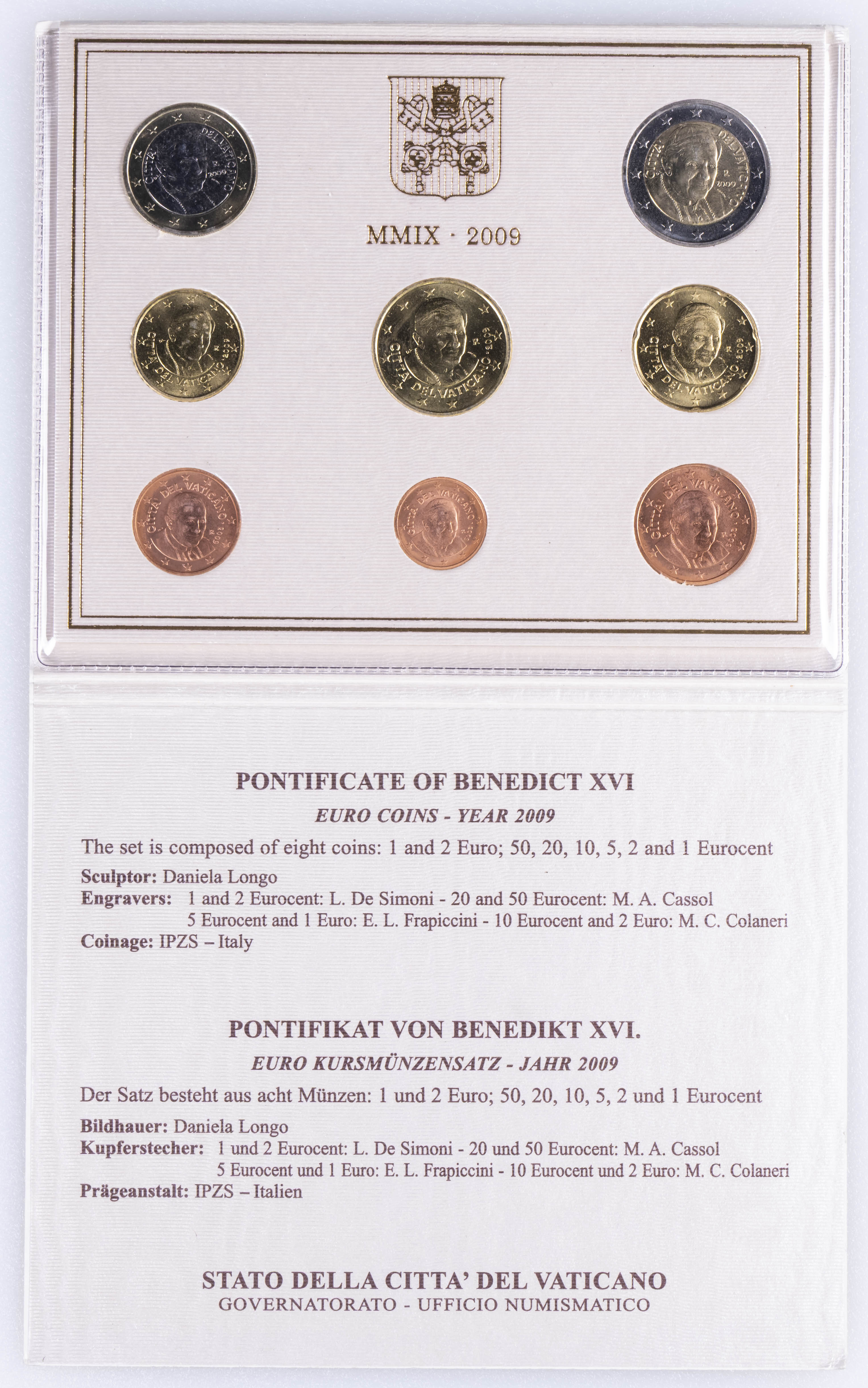 VATICANO, Benedicto XVI. Cartera completa de 8 valores de Euros correspondientes al año 2009. 80 Aniversario de la fundación de la Ciudad Estado del Vaticano. SC.