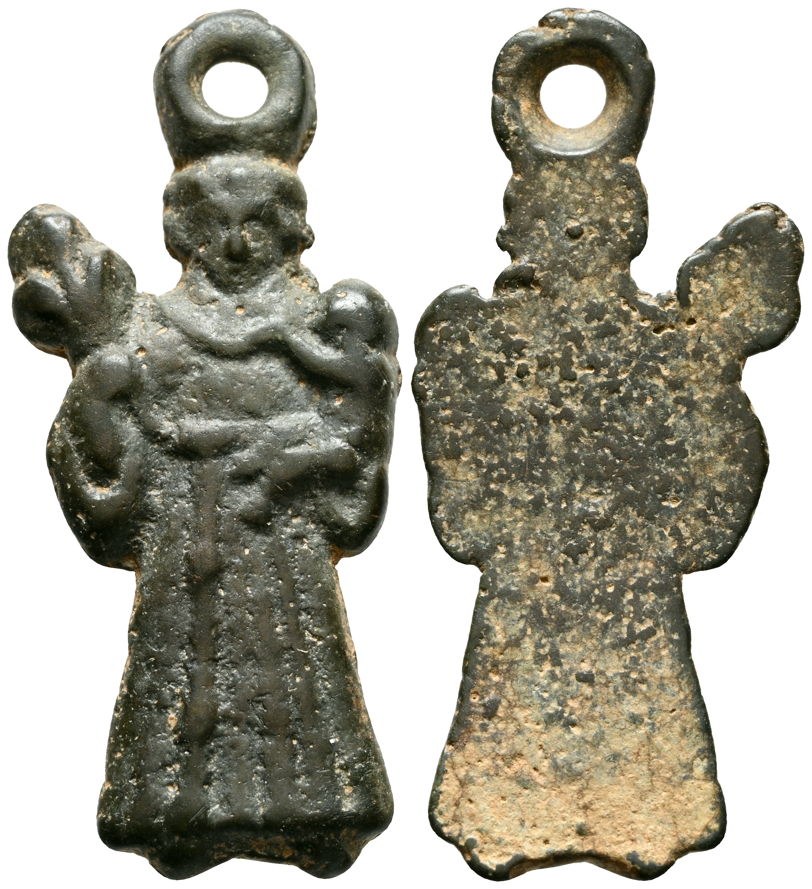 IMAGEN-MEDALLA. (Ae. 2,68g/29x12mm). Siglo XVI-XIX. San Antonio cargando Niño Jesús a derecha y portando ramillete de azucenas a izquierda. MBC+.