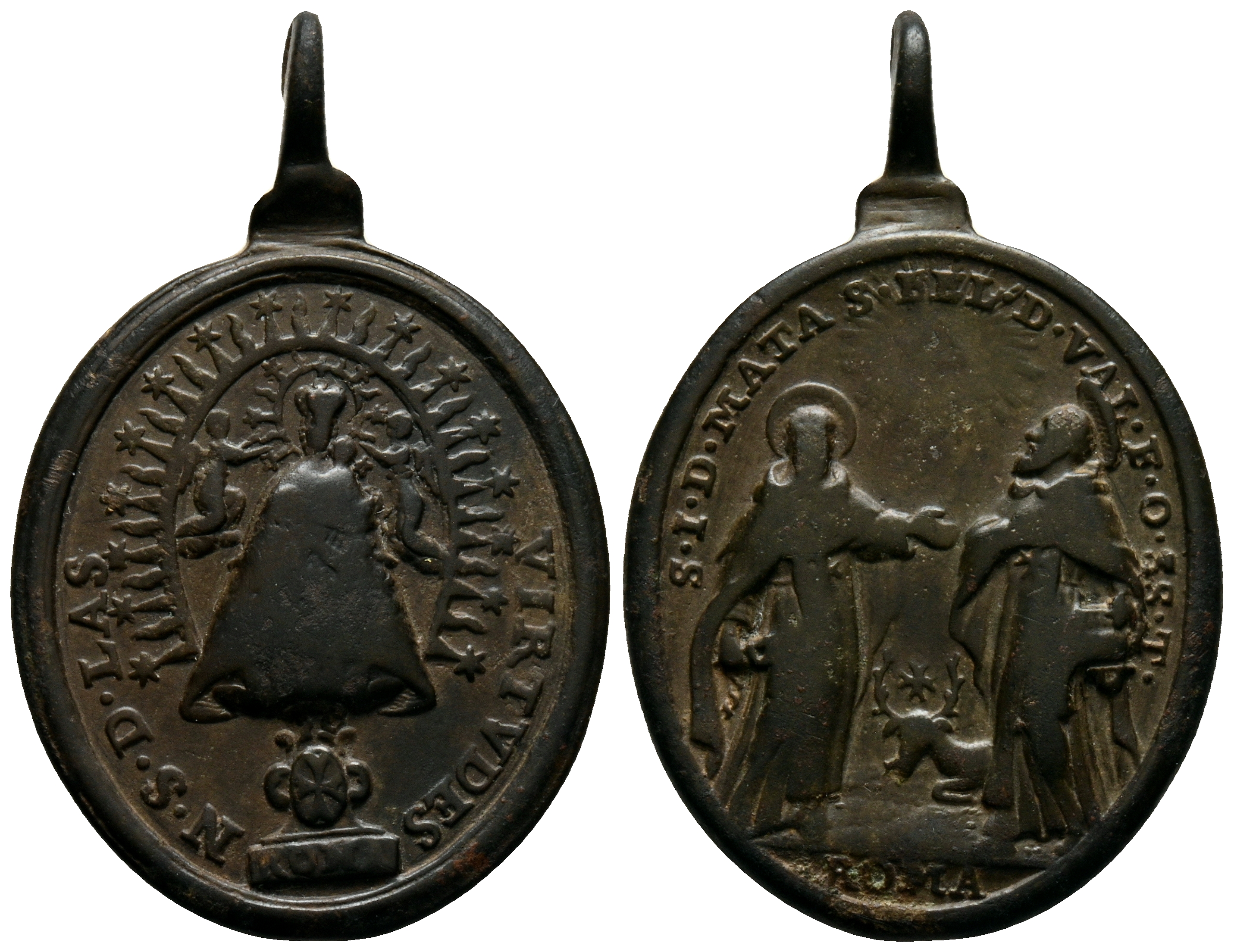 MEDALLA DEVOCIONAL. (Ae. 12,09g/43x28mm). Siglo XVI-XIX. Roma. Anv: Nuestra Señora de las Virtudes sobre peana con escudo trinitario y la palabra: Roma, alrededor: N. S. D. LAS VIRTVDES. Rev: San Juan de Mata y San Félix de Valois enfrentados con ciervo a sus pies, en exergo: ROMA, alrededor: S. I. D. MATA S. FEL. D. VAL. F. O. SS. T. MBC.