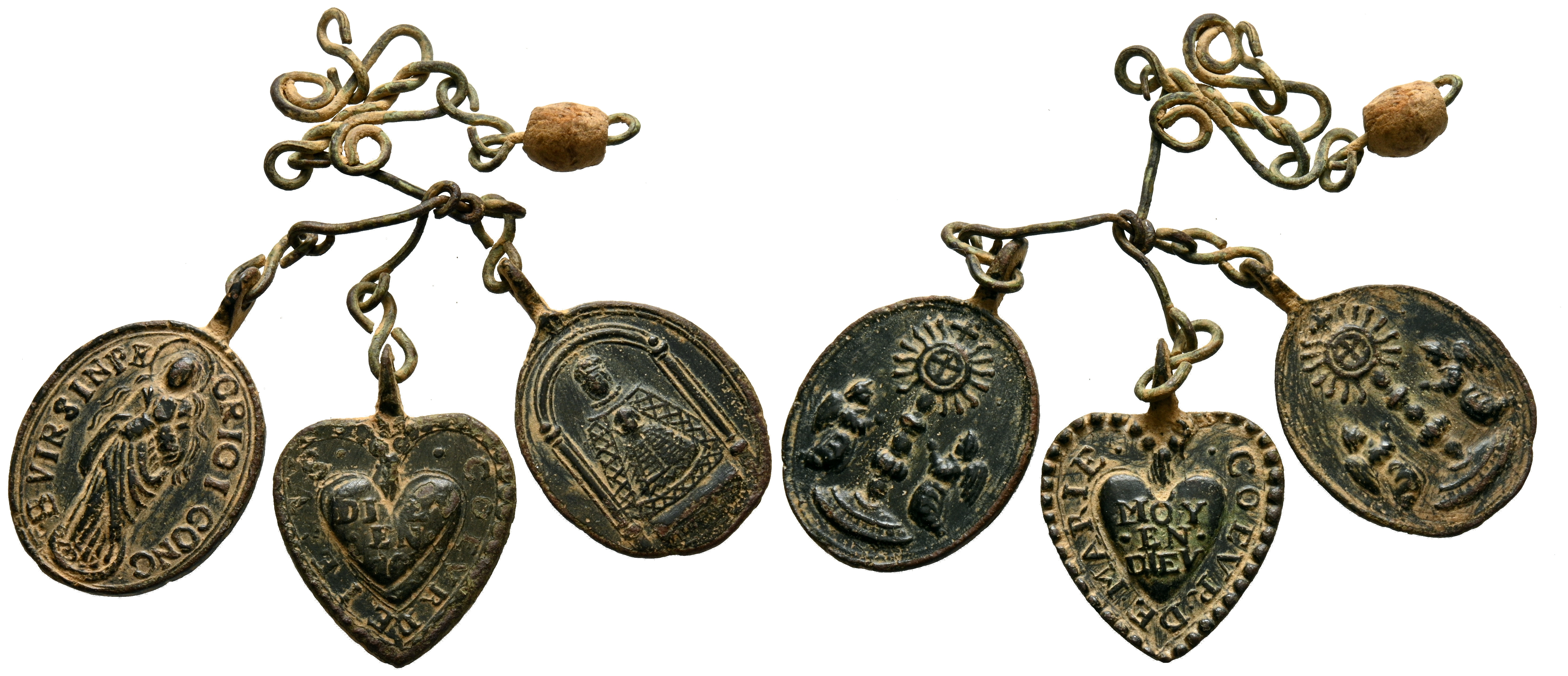 ORNAMENTO DE MEDALLAS DEVOCIONAL. (Ae. 9,08g/85mm). Siglo XVI-XIX. Cadeneta de filigrana de la cual penden tres medallas bellamente ornamentadas con motivos sacramentales y rogativos a la Virgen María. MBC+.