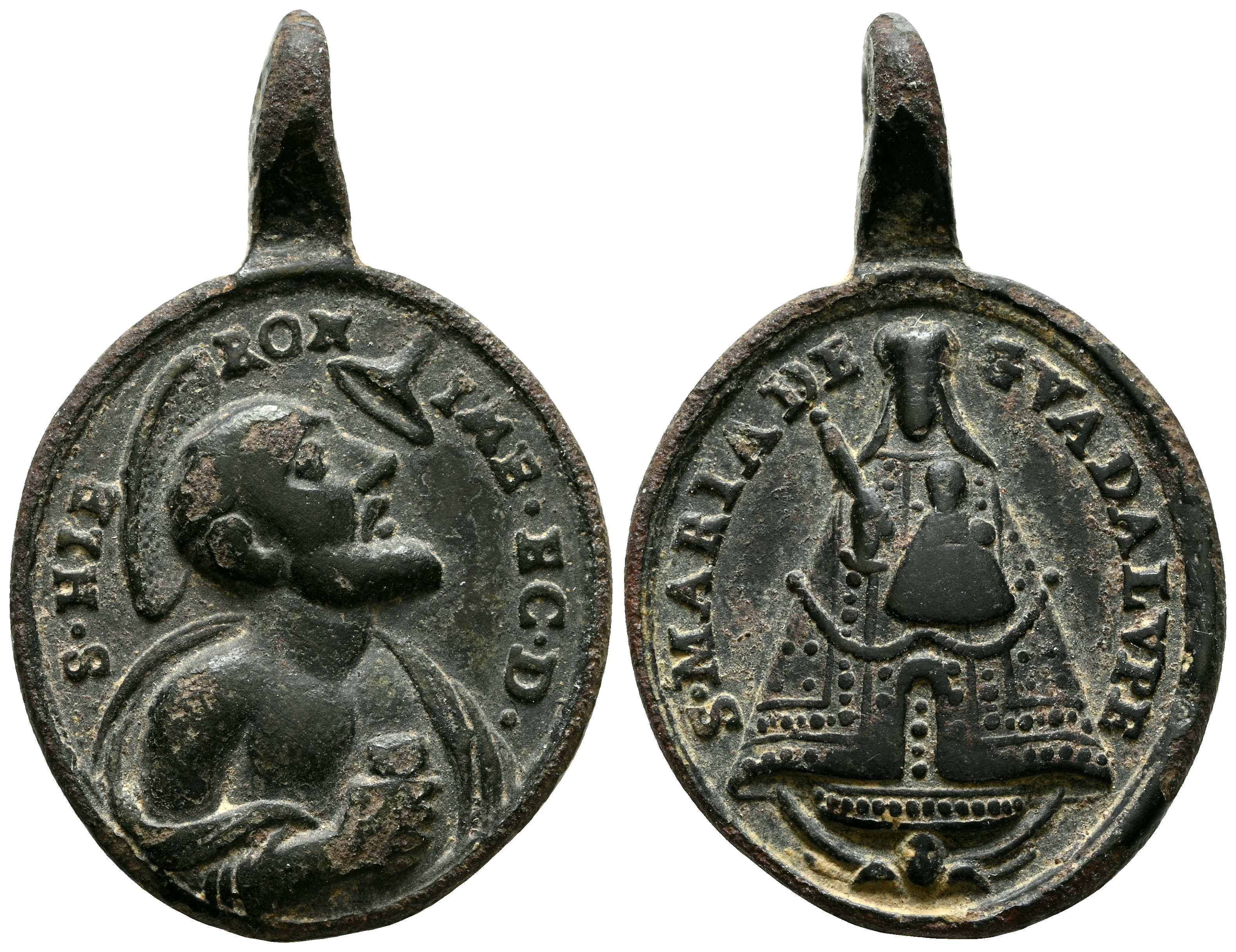 MEDALLA DEVOCIONAL. (Ae. 2,29g/24x16mm). Siglo XVI-XIX. Anv: Virgen del Guadalupe, alrededor: S. MARIA DE GVADALVPE. Rev: San Jerónimo, alrededor: S. HIERONIME. EC. D. MBC.