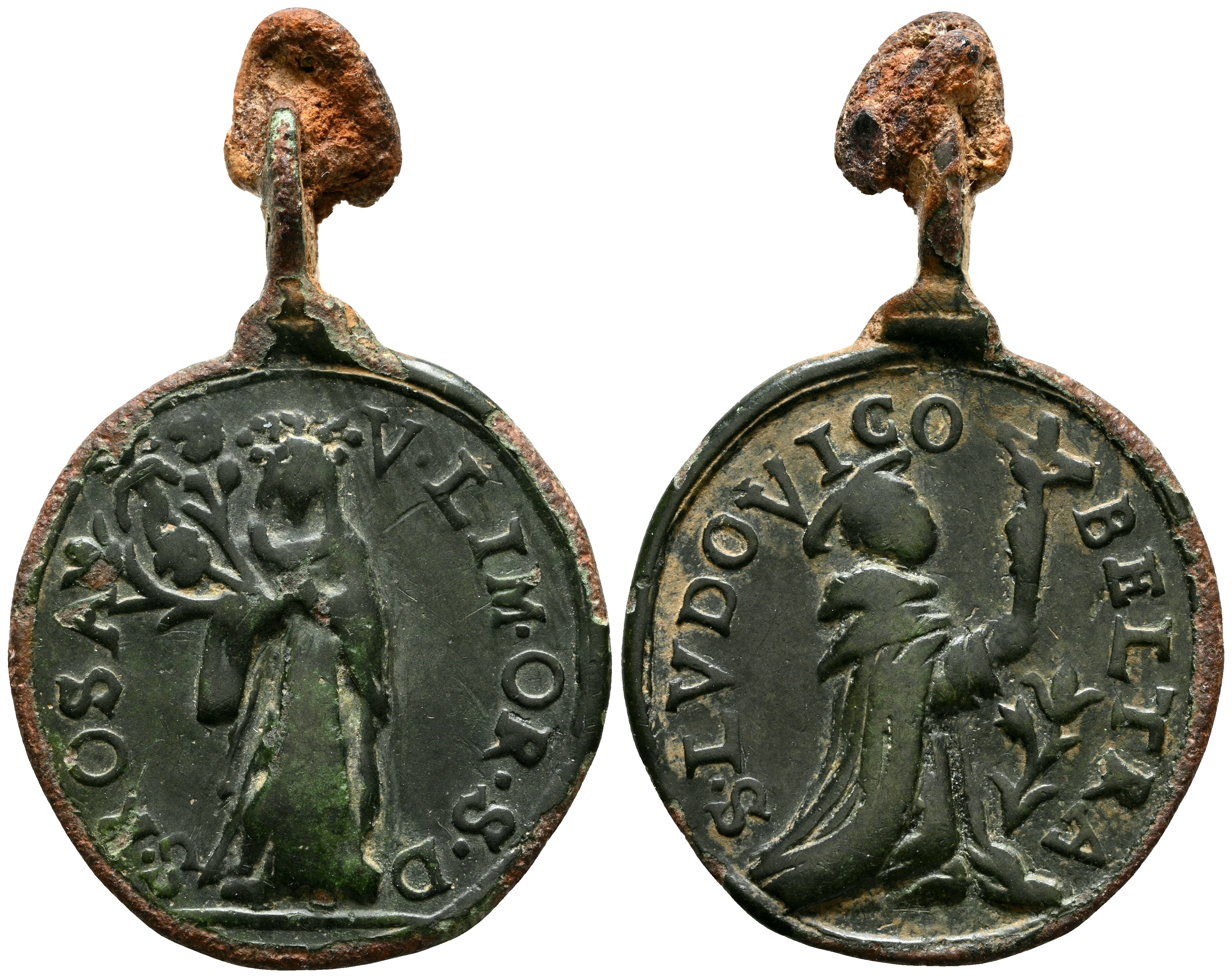 MEDALLA DEVOCIONAL. (Ae. 2,66g/31x20mm). Siglo XVI-XIX. Anv: Santa Rosa de Lima, alrededor: S. ROSA. V. LIM. OR. S. D. Rev: San Luis Beltrán, alrededor: S. LVDOVICO BELTRA. MBC.