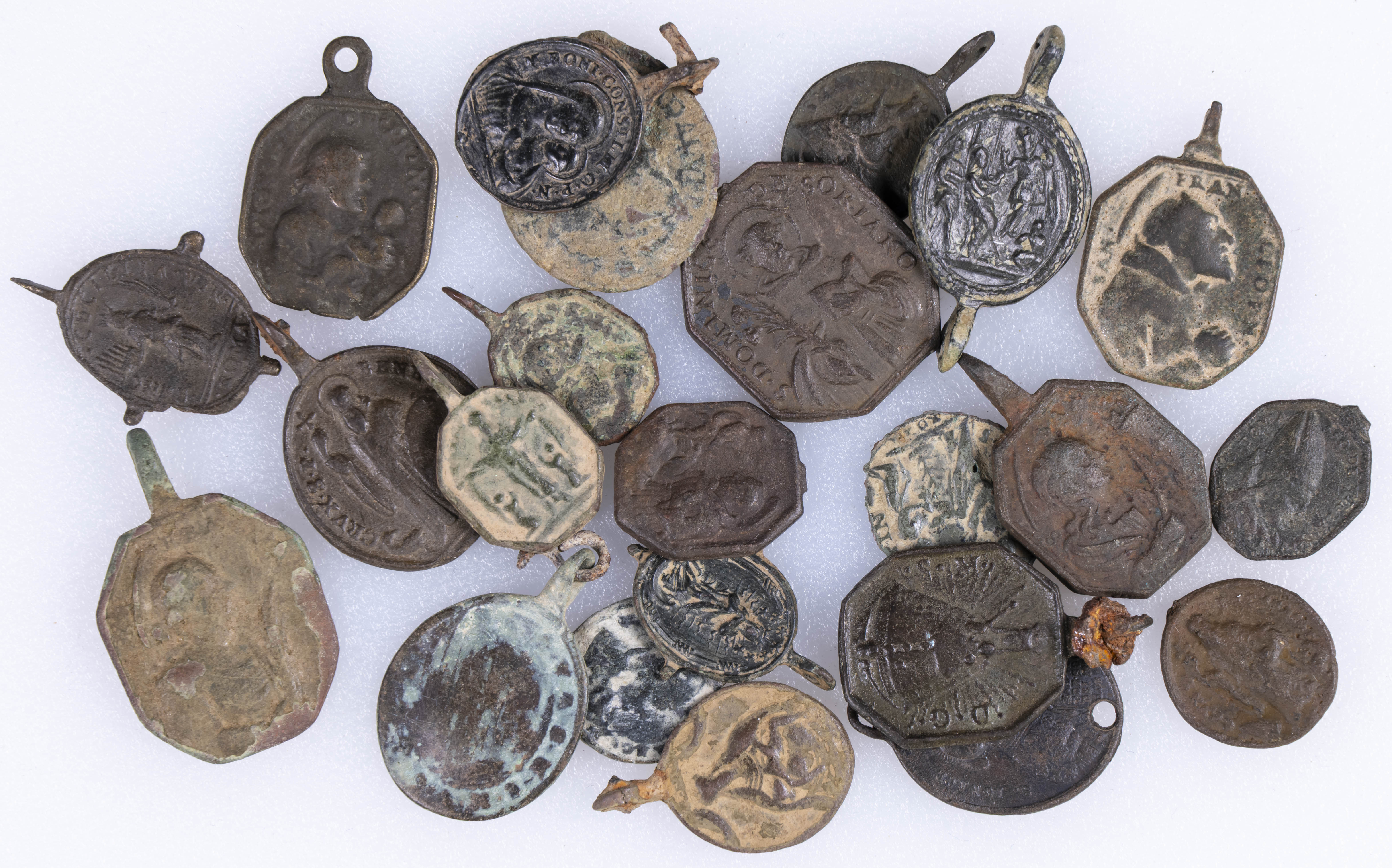 Interesantísimo conjunto de medallas devocionales, compuesto por 23 preciosas piezas, realizas entre el siglo XVII y XIX. A destacar un gran variedad de abvocaciones y santos como; Ntrs. Sr. de Atocha; Ntrs. Sr. de Monserrat; Mater Dolorosa, Inmaculada Concepción; Santa Barbara, Corazón de Jesús y María, S. Miguel Arcángel, S. Juan Evangelista y S. Antonio en otros. Diferentes variantes, medidas y estados de conservación. A EXAMINAR