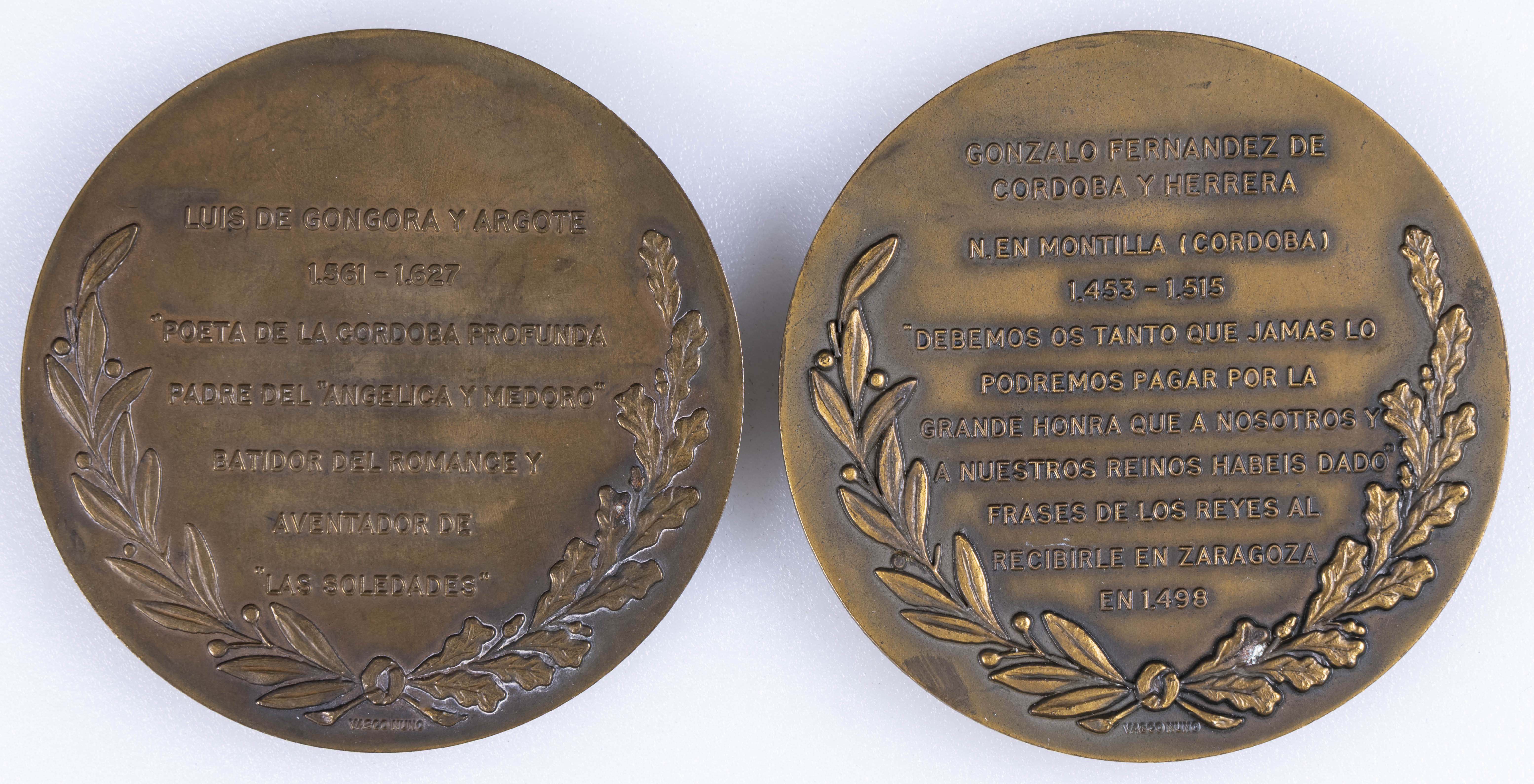 Conjunto de 2 medallas de bronce dedicadas a Luis de Góngora y Gonzalo Fernández de Córdoba. Ambas piezas numeradas (67/500 y 24/500 respectivamente). Peso medio por pieza: 200 gramos. Excelente estado de conservación. A EXAMINAR