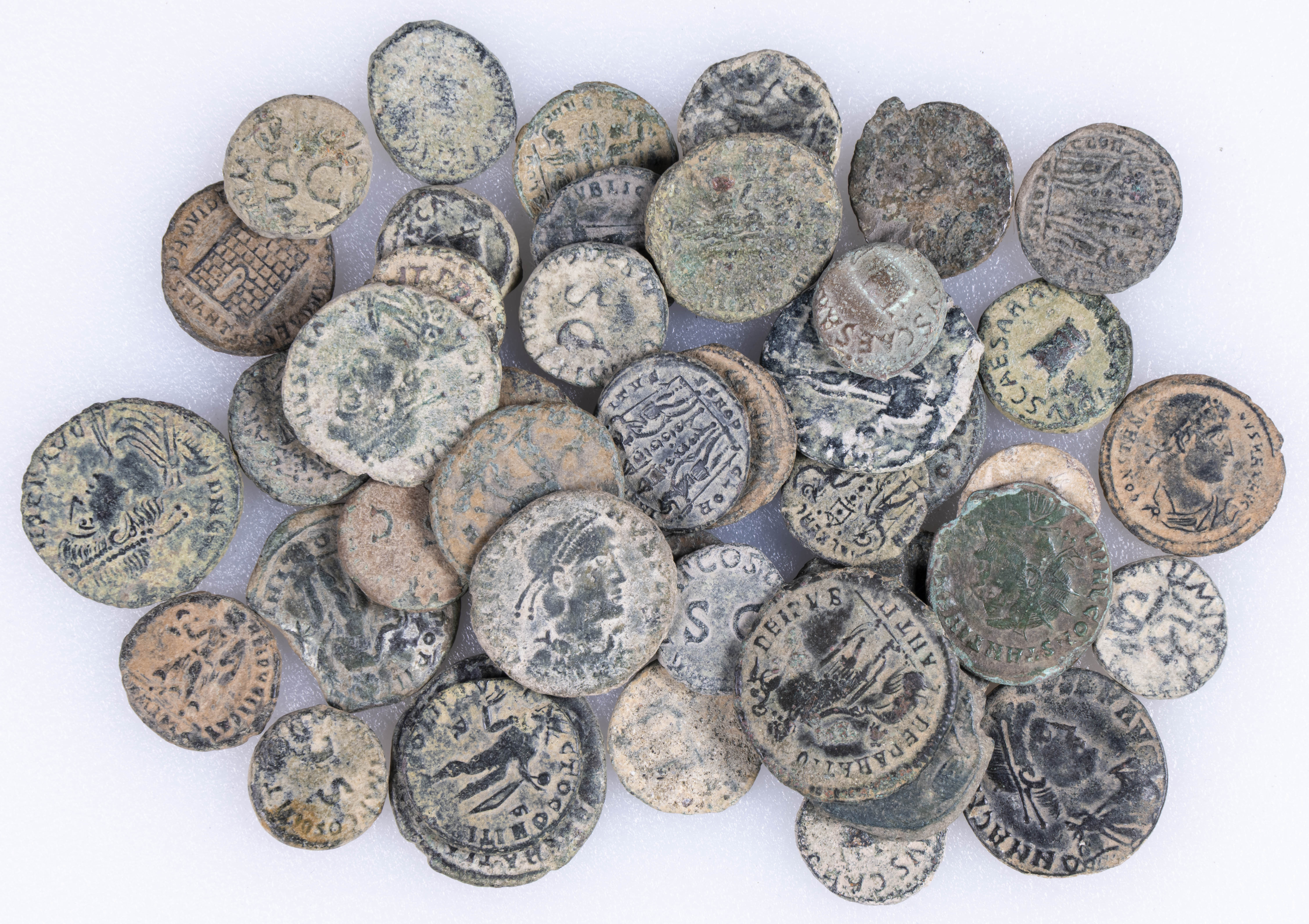 IMPERIO ROMANO. Interesante conjunto formado por 46 monedas variadas acuñadas en época de alto y bajo imperio. Diferentes módulos, cecas, medidas y estados de conservación. A EXAMINAR.