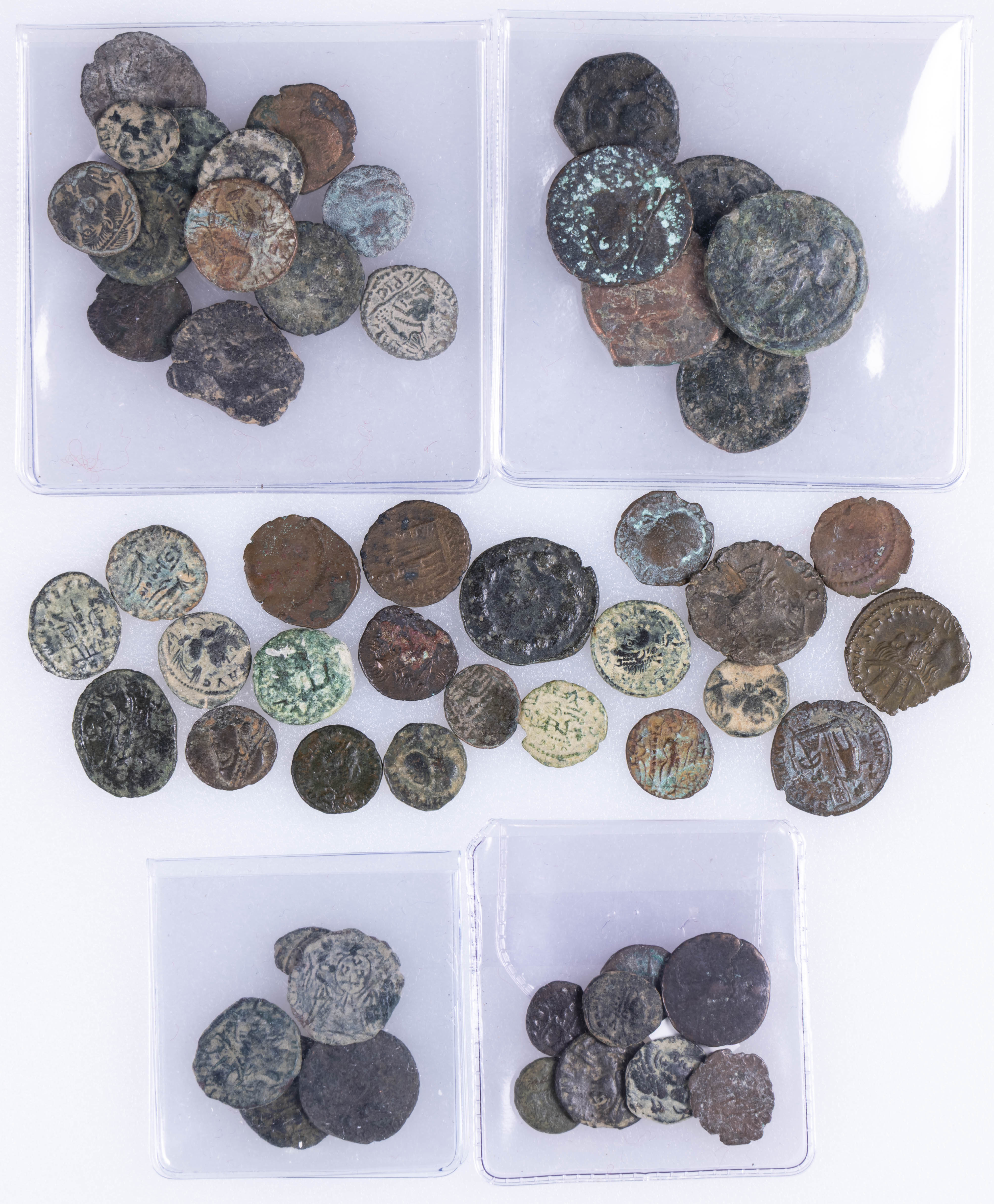 IMPERIO ROMANO. Interesantísimo conjunto formado por 53 bronces bajo imperiales. A destacar las piezas a nombre de Teodosio, Constantino I y Graciano, así como una importante cantidad de imitaciones bárbaras a nombre de los dos últimos. Inlcuye dos piezas con errores de acuñación. Diferentes medidas, cecas y estados de conservación. A EXAMINAR.