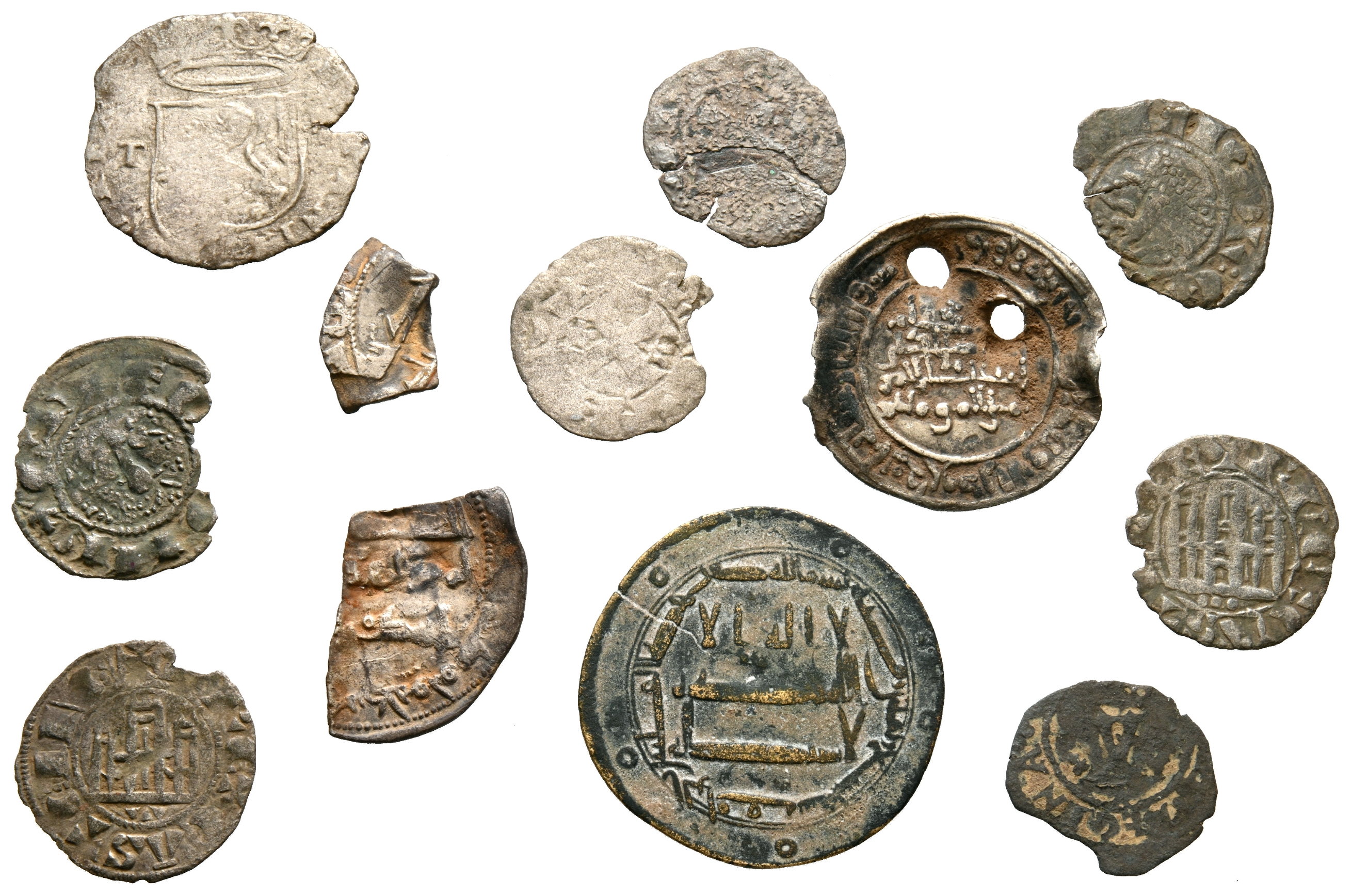 EPOCA MEDIEVAL e HISPANO ARABE. Interdante conjunto formado por 12 acuñaciones muy variadas, corespondientes a diferentes reyes y califas. Incluye un falsario del califato abbasí. Diferentes metales, módulos, cecas y estados de conservación. A EXAMINAR.