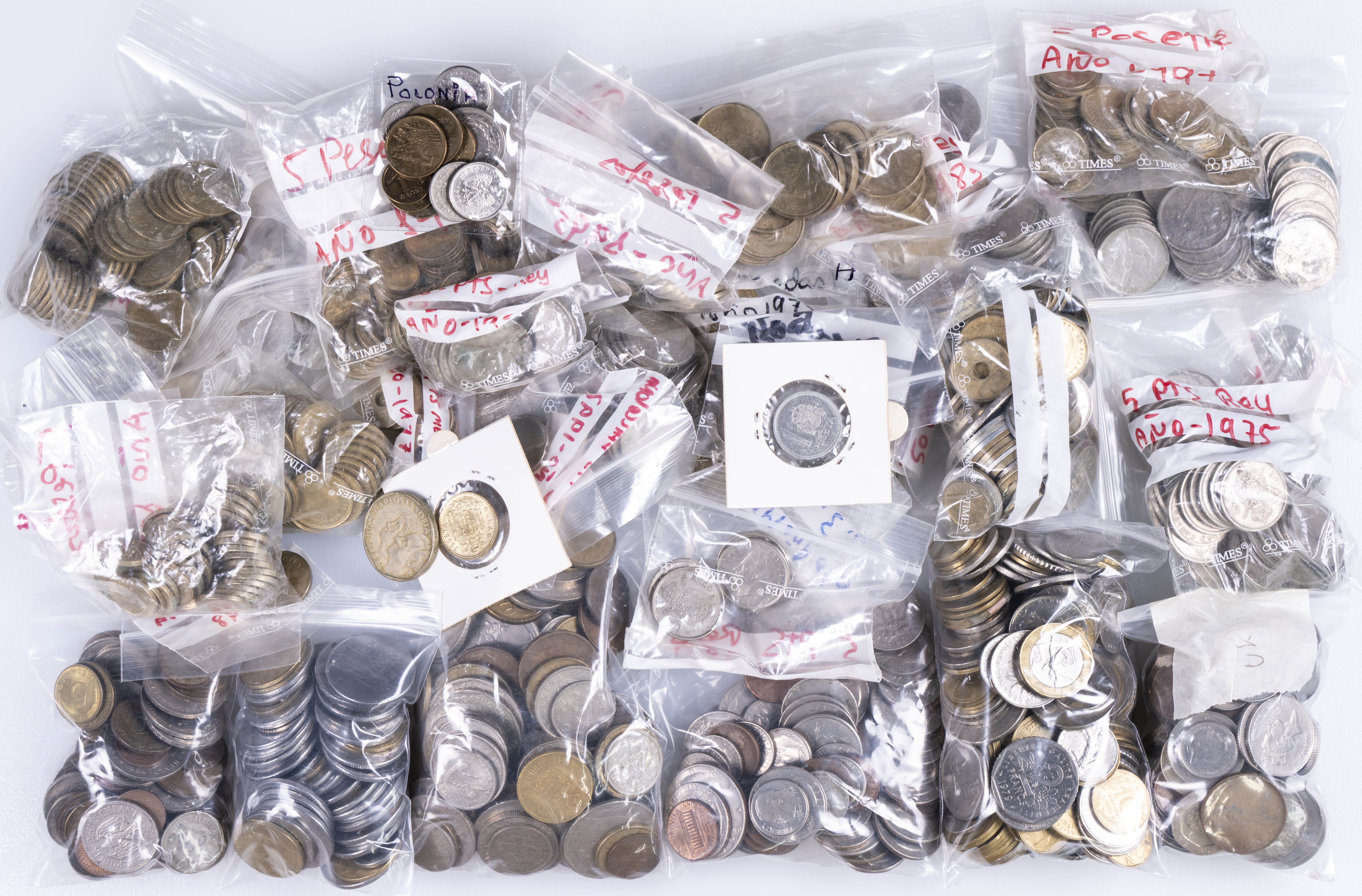 Conjunto formado por centenares de monedas tanto españolas (Estado Español y Contemporáneo) como extranjeras acuñadas a lo largo del siglo XX, con gran variedad de módulos y países representados. Diferentes estados de conservación. A EXAMINAR.