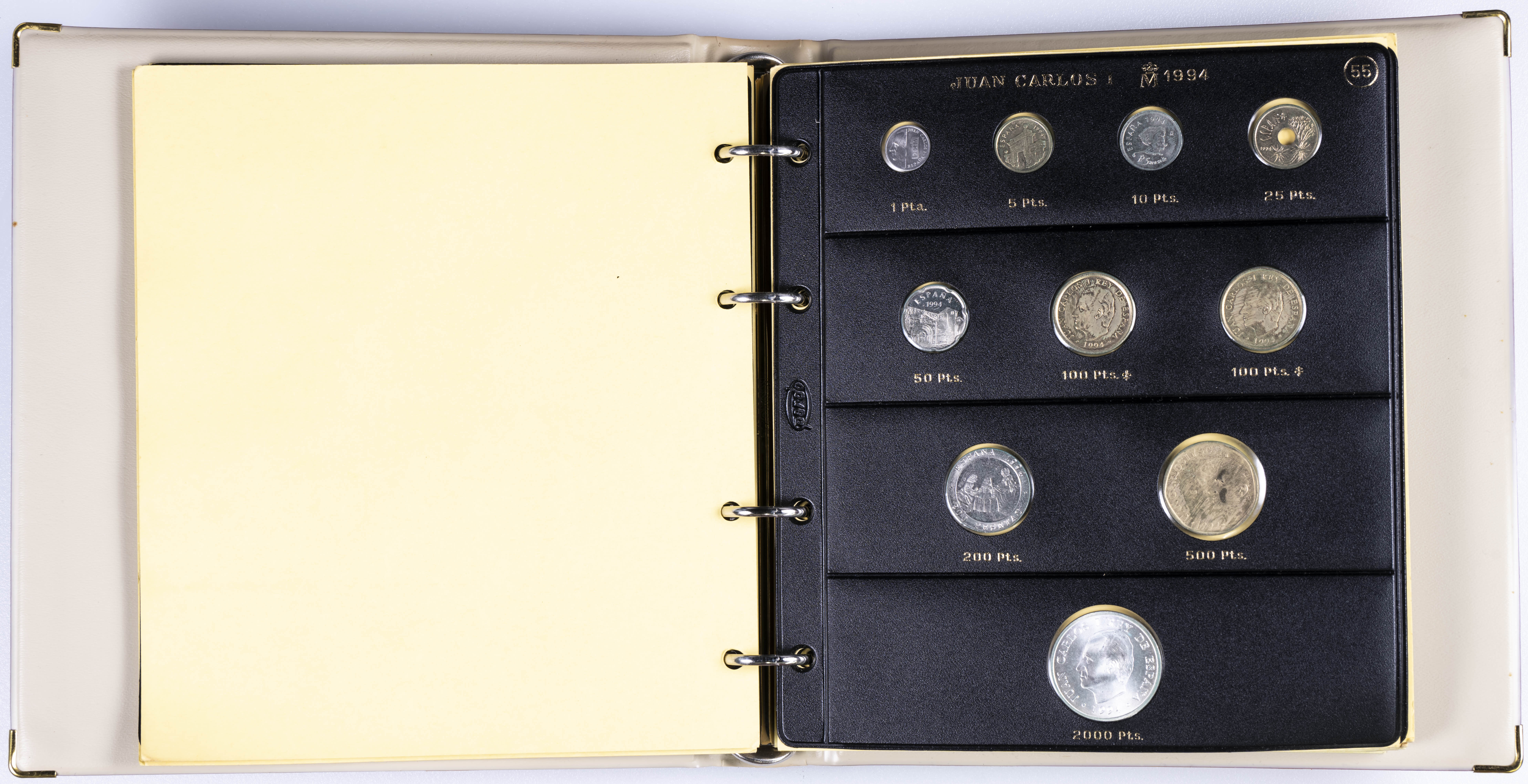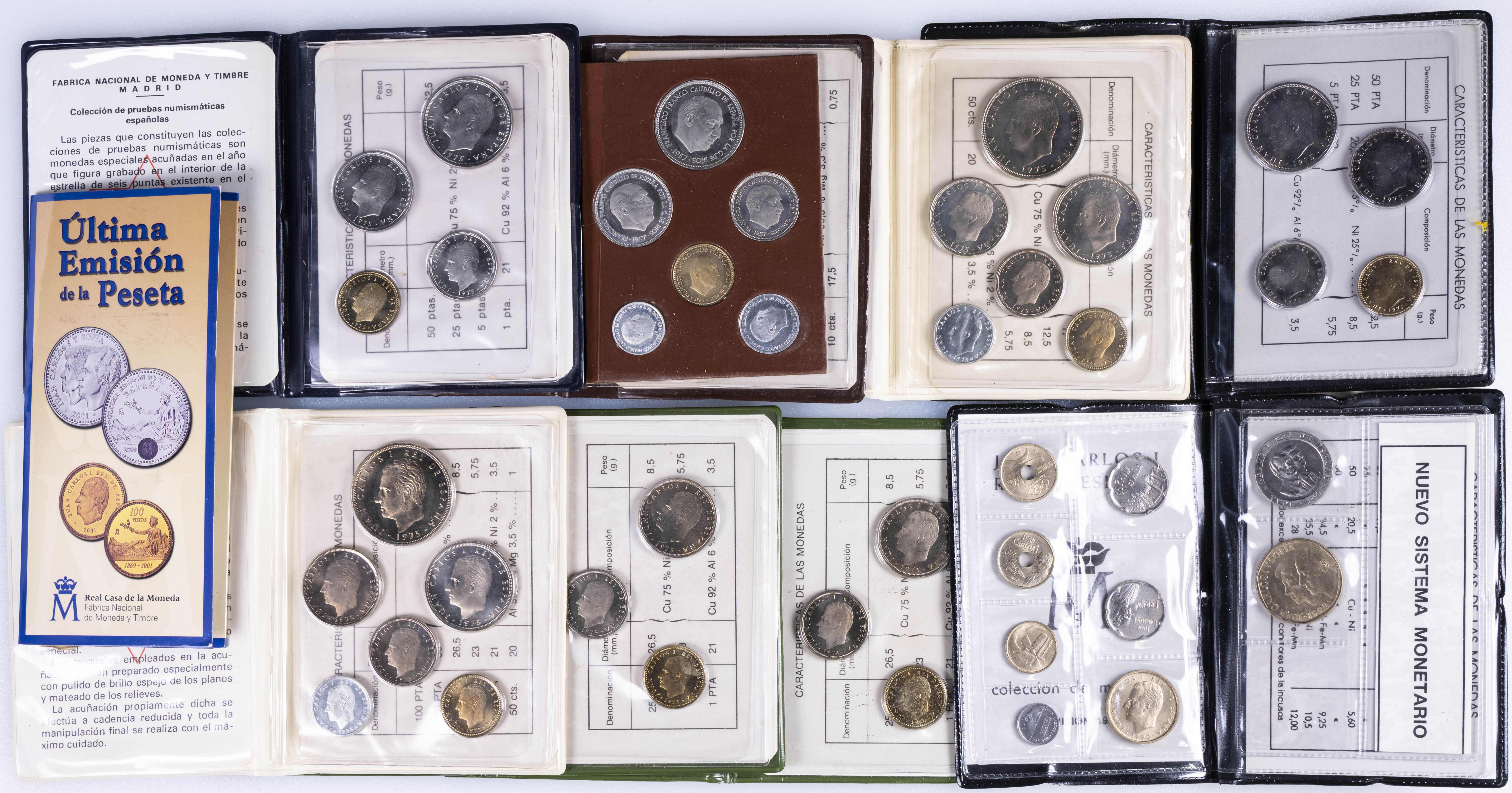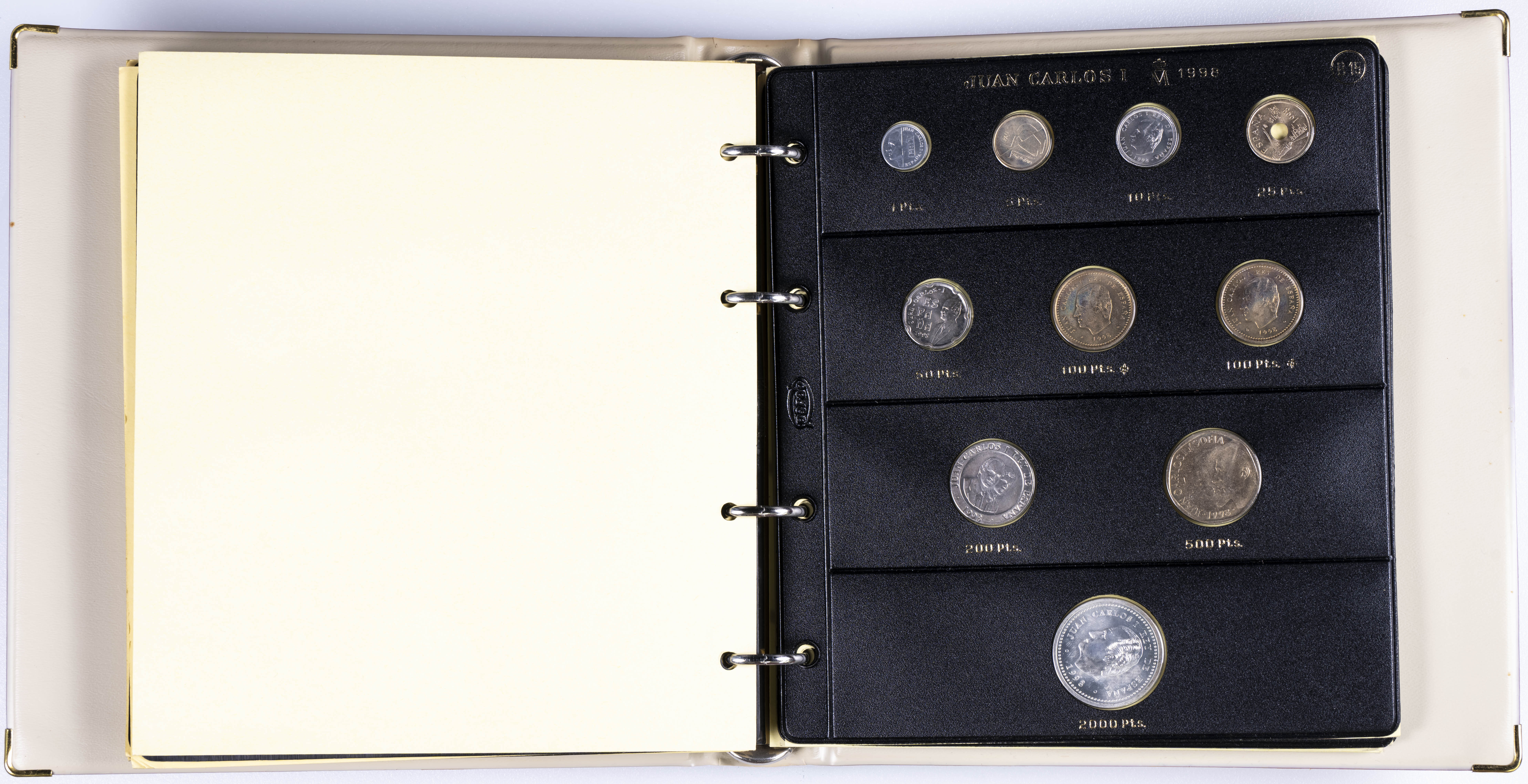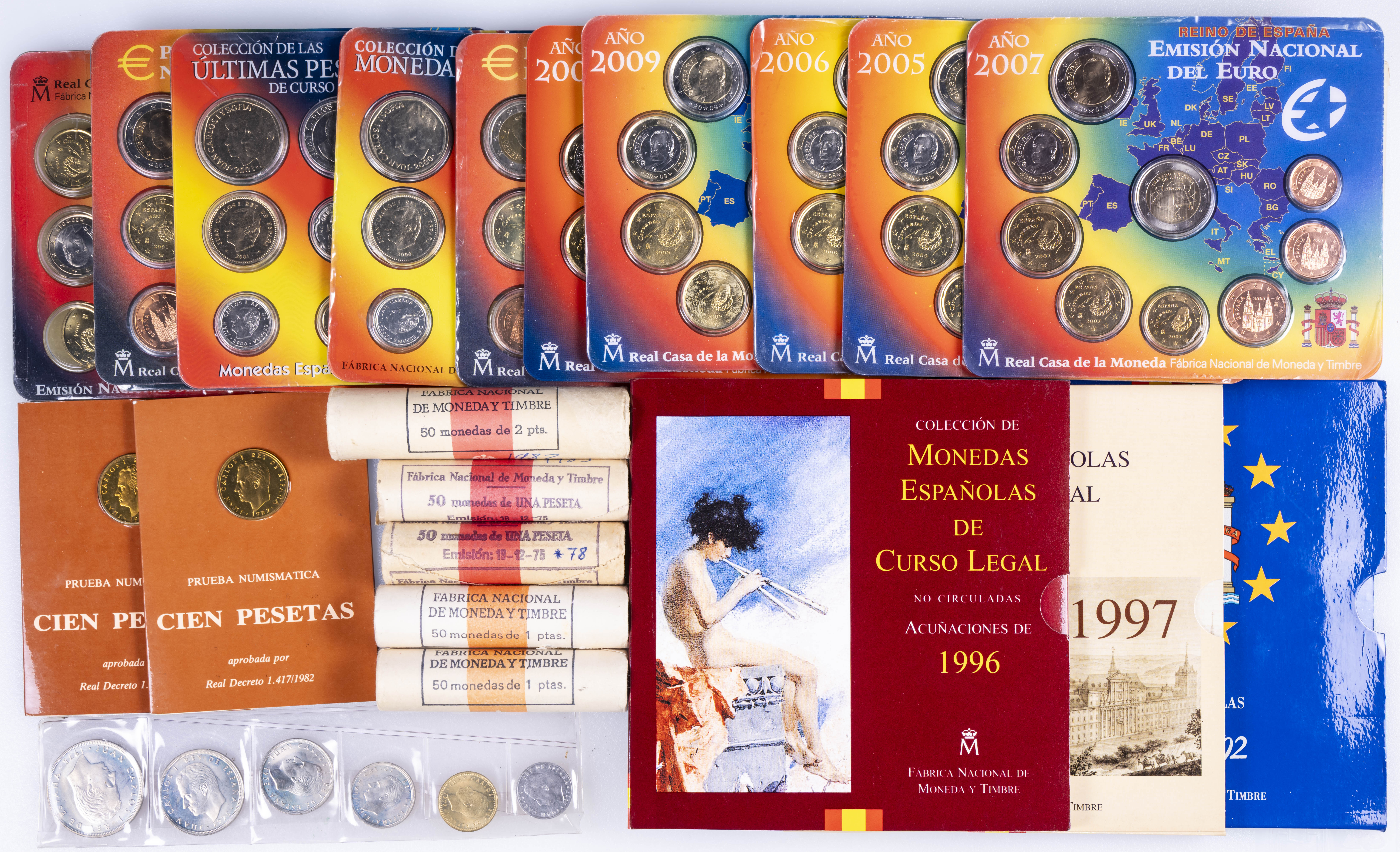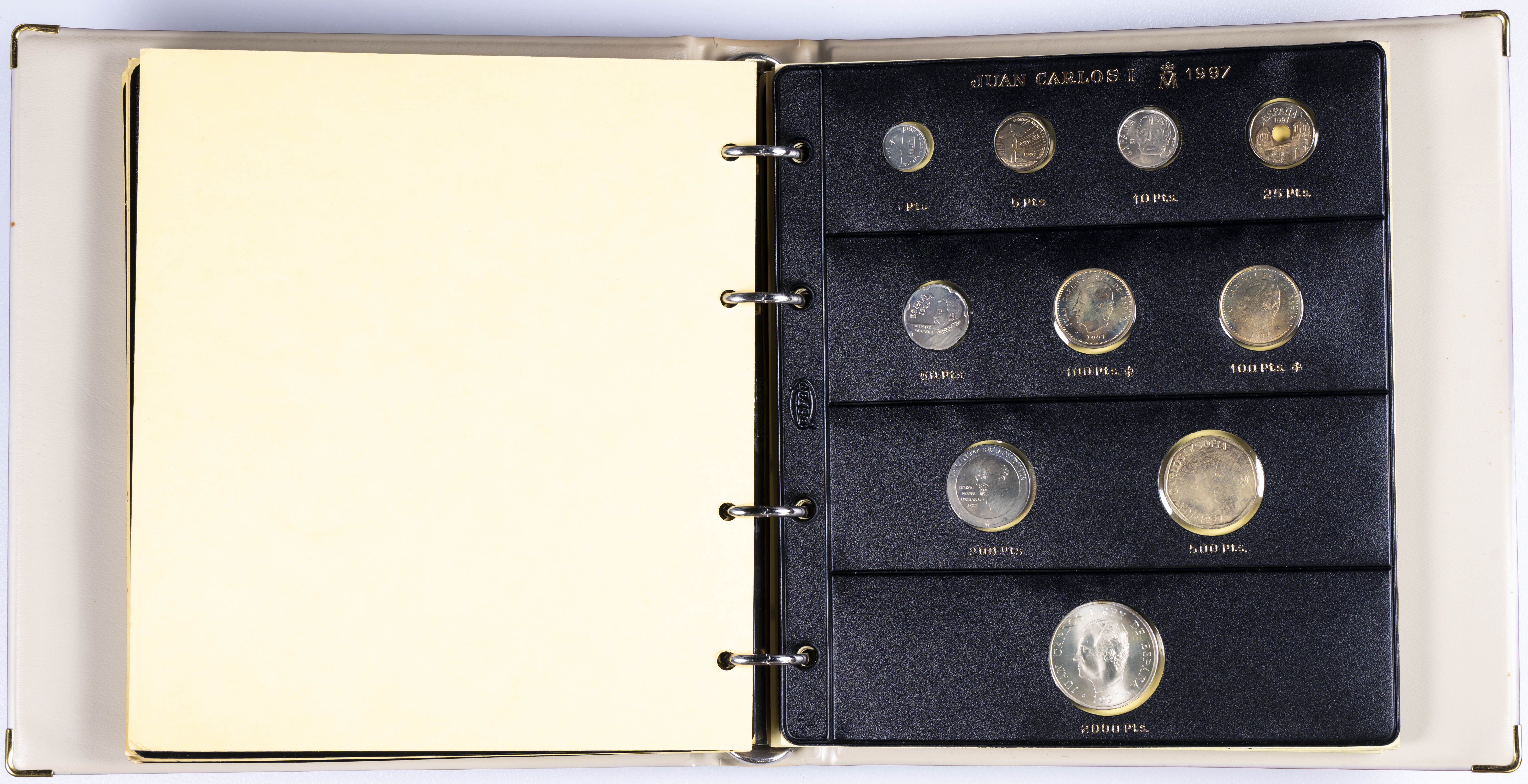 JUAN CARLOS I (1975-2014). Interesante y muy completa colección expuesta en 2 álbumes que incluye, además, sets, cartuchos, estuches, carteras y tiras. Incluye un buen número de ejemplares en plata. Colección en alto grado de conservación general. A EXAMINAR.