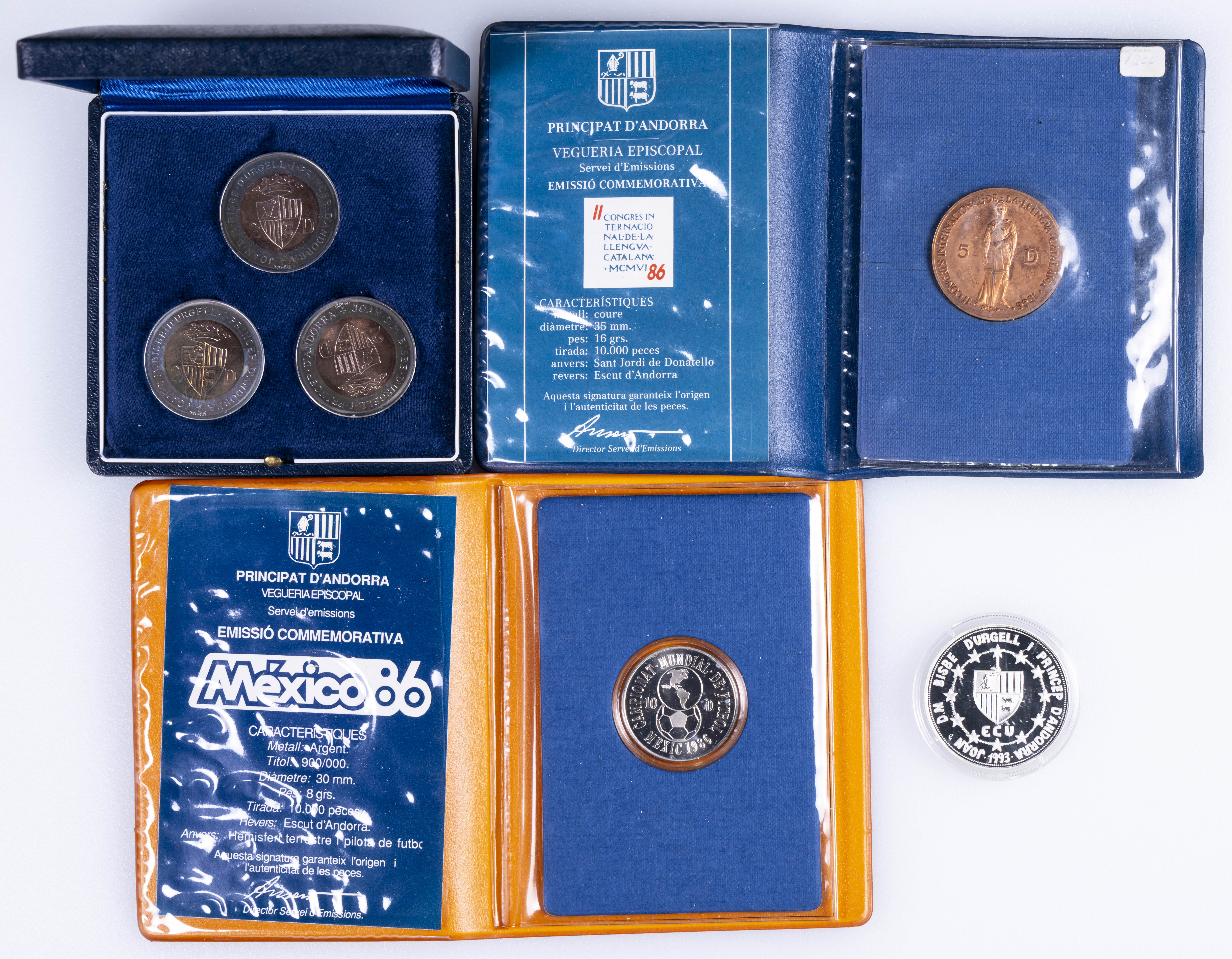 ANDORRA. Interesante conjunto formado por estuches/carteras conmemorativas emitidas a finales del siglo XX. Diferentes temáticas y materiales, incluyendo plata. Terminaciones PROOF y SC. A EXAMINAR.