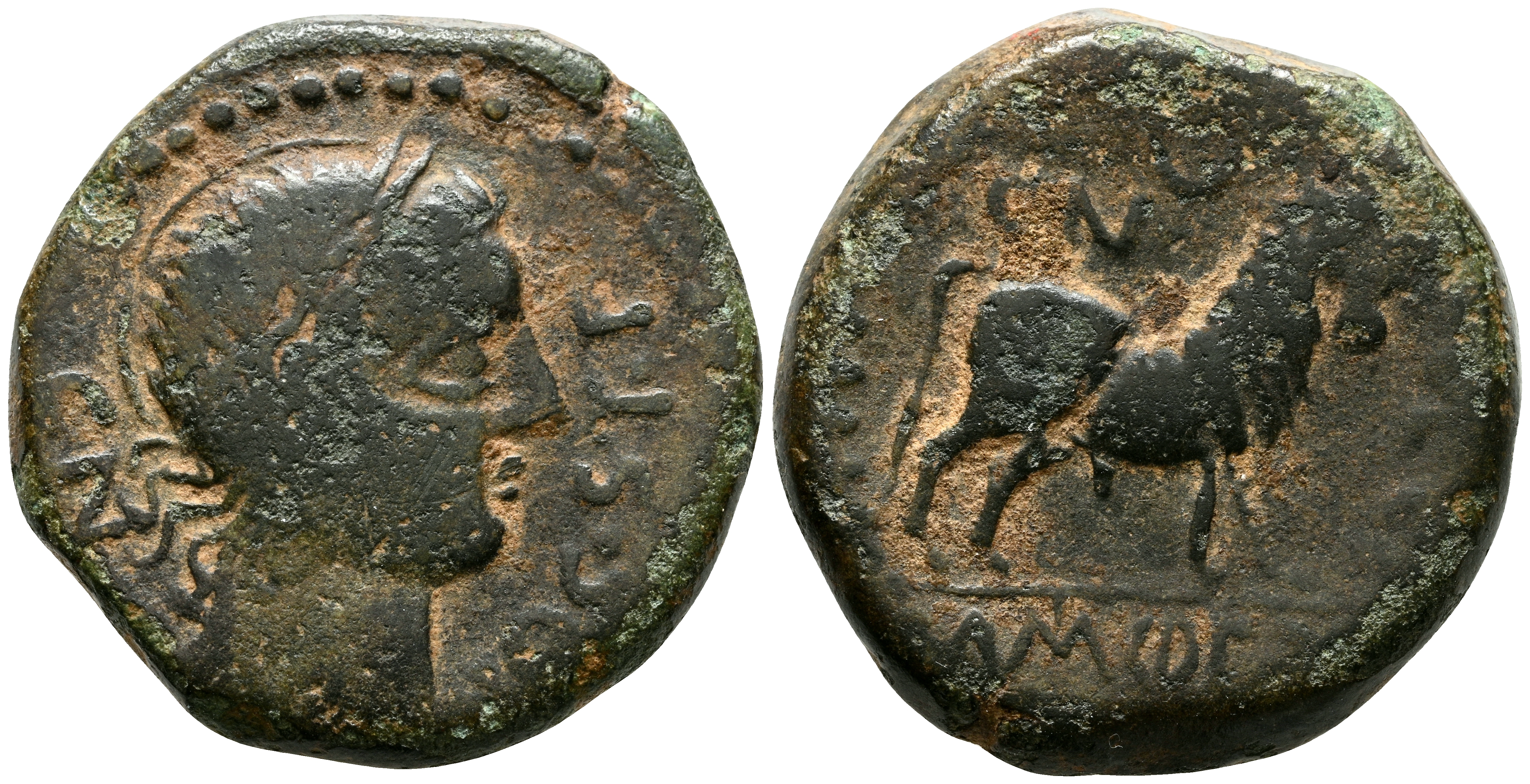 CASTULO (Cazlona, Jaén). Semis. (Ae. 11,63g/25mm). 180 a.C. (FAB-728). Anv: Cabeza masculina diademada a derecha, alrededor leyenda: CN VOC STFR. Rev: Toro a derecha, encima: CN creciente, delante: CN FVL CN F, debajo leyenda ibérica: CaSTeLe. MBC-.