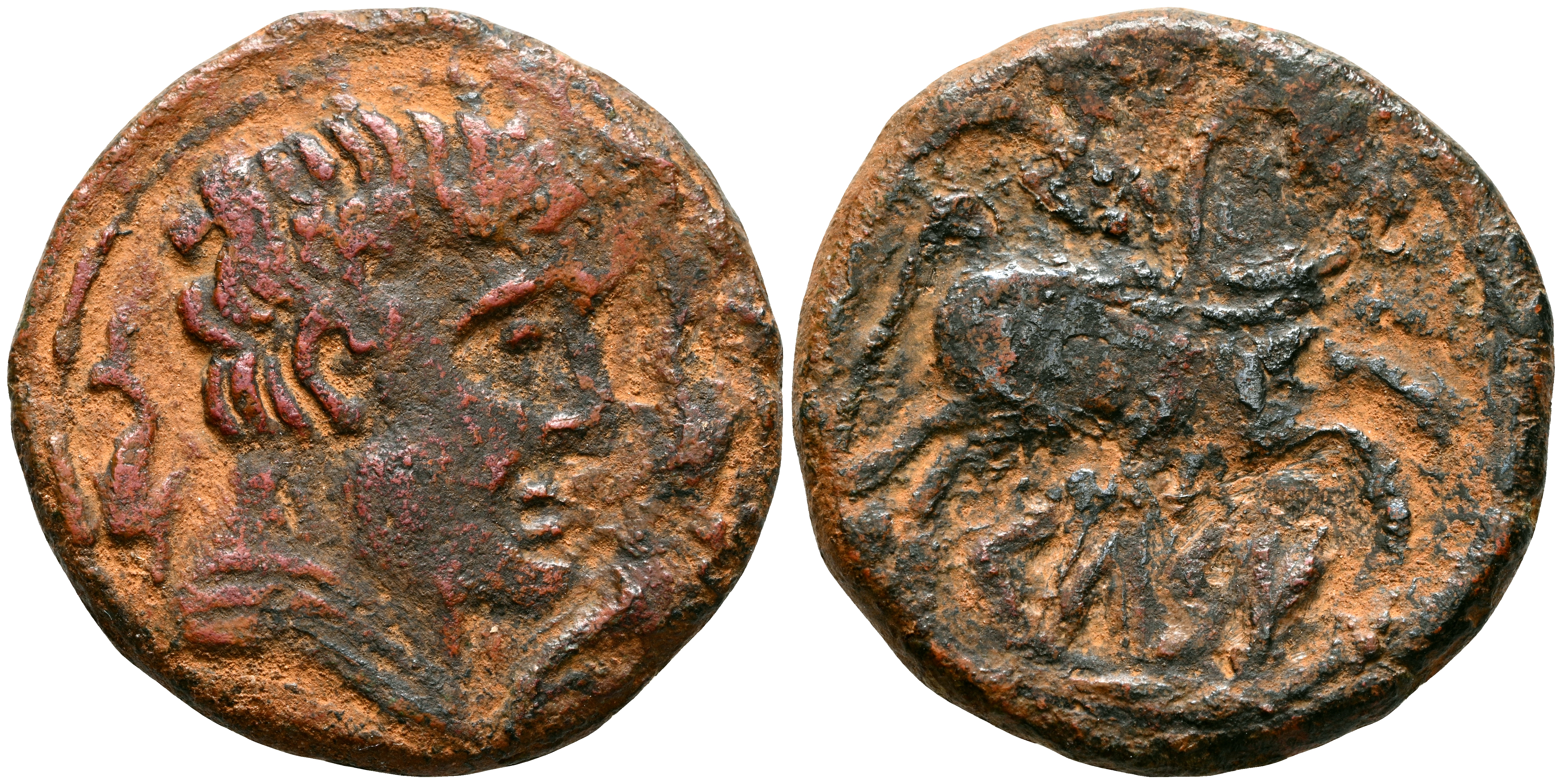CELSE (Velilla de Ebro, Zaragoza). As. (Ae. 11,15g/28mm). 120-50 a.C. (FAB-771). Anv: Cabeza masculina a derecha con manto y fíbula, alrededor de tres delfines. Rev: Jinete con palma a derecha, debajo leyenda ibérica sobre línea: CeLSE. MBC.