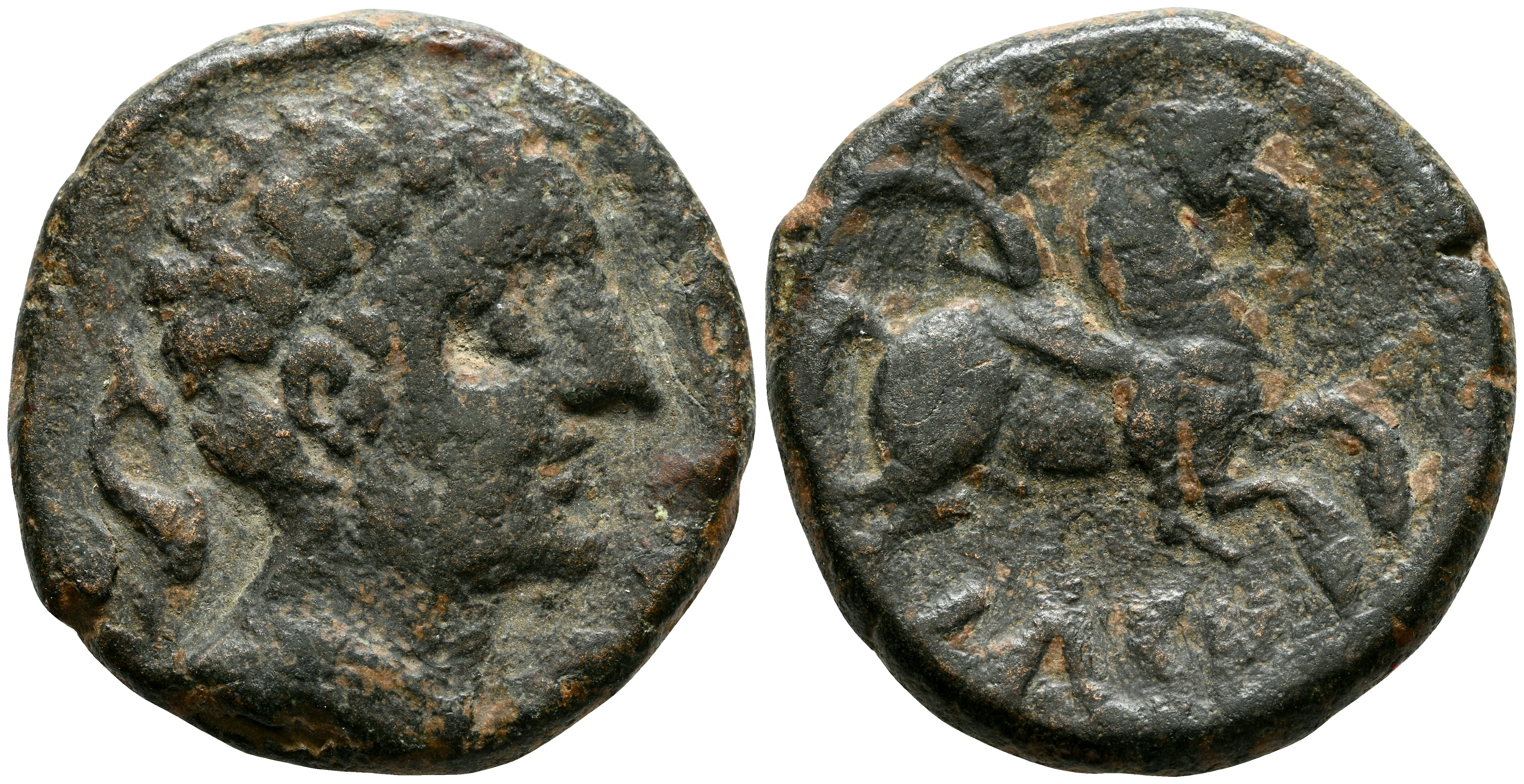 CELSE (Velilla del Ebro, Zaragoza). As. (Ae. 13,60g/27mm). 120-50 a.C. (FAB-771). Anv: Cabeza a derecha con manto y fíbula a derecha, alrededor tres delfines. Rev: Jinete con palma a derecha, debajo leyenda ibérica sobre línea: CeLSE. MBC-. Limpiada.