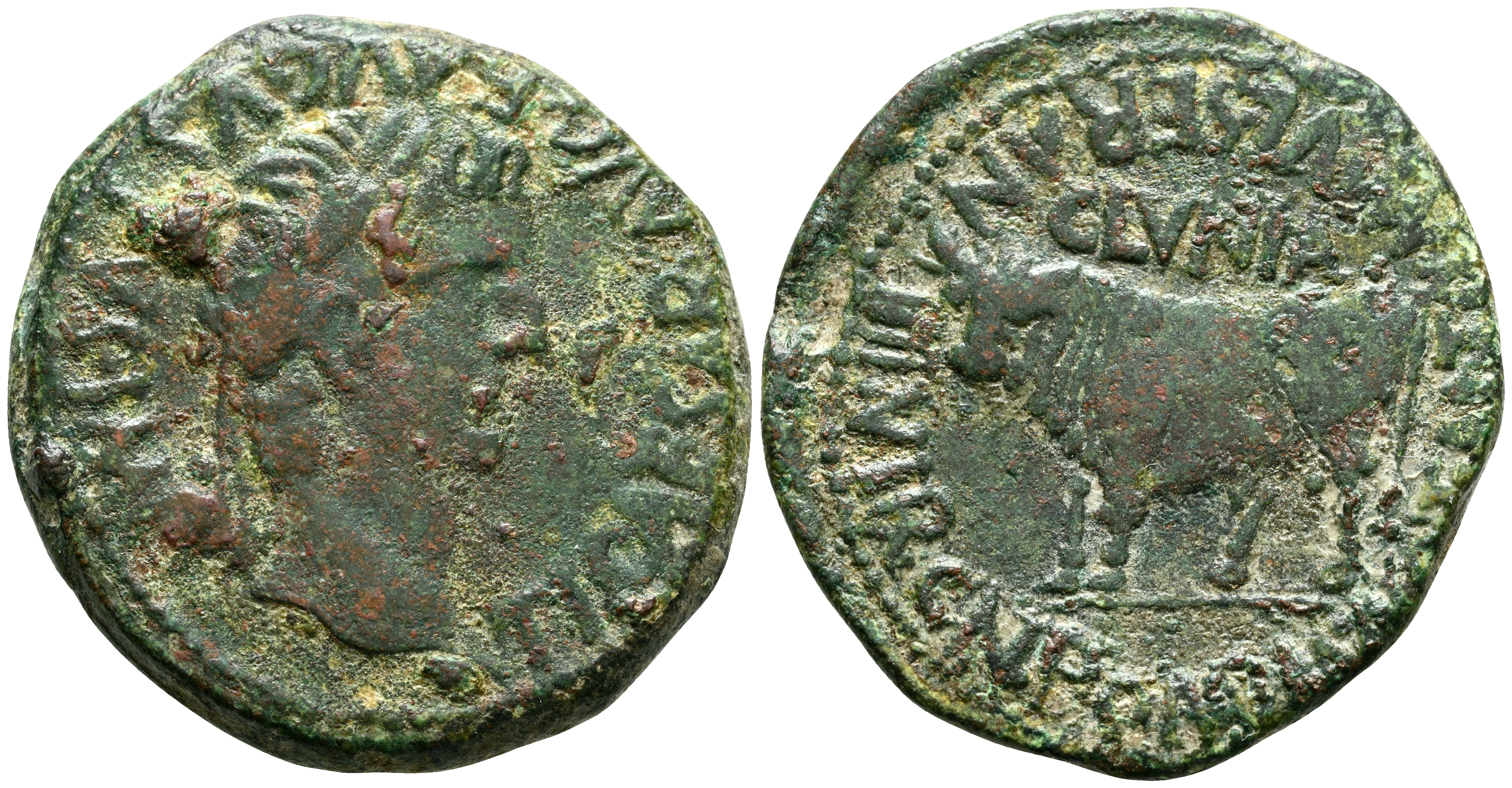 CLUNIA (Coruña del Conde, Burgos). As. (Ae. 10,40 g/27mm). 37-41 d.C. (FAB-836). Anv: Cabeza laureada de Tiberio a derecha, alrededor leyenda: TI CAESAR AVG F AVGVSTVS IMP. Rev: Toro a izquierda, encima leyenda: CLVNIA, alrededor leyenda: CN POMP M ANTO T ANTO M IVL SERAN III VIR. MBC-.