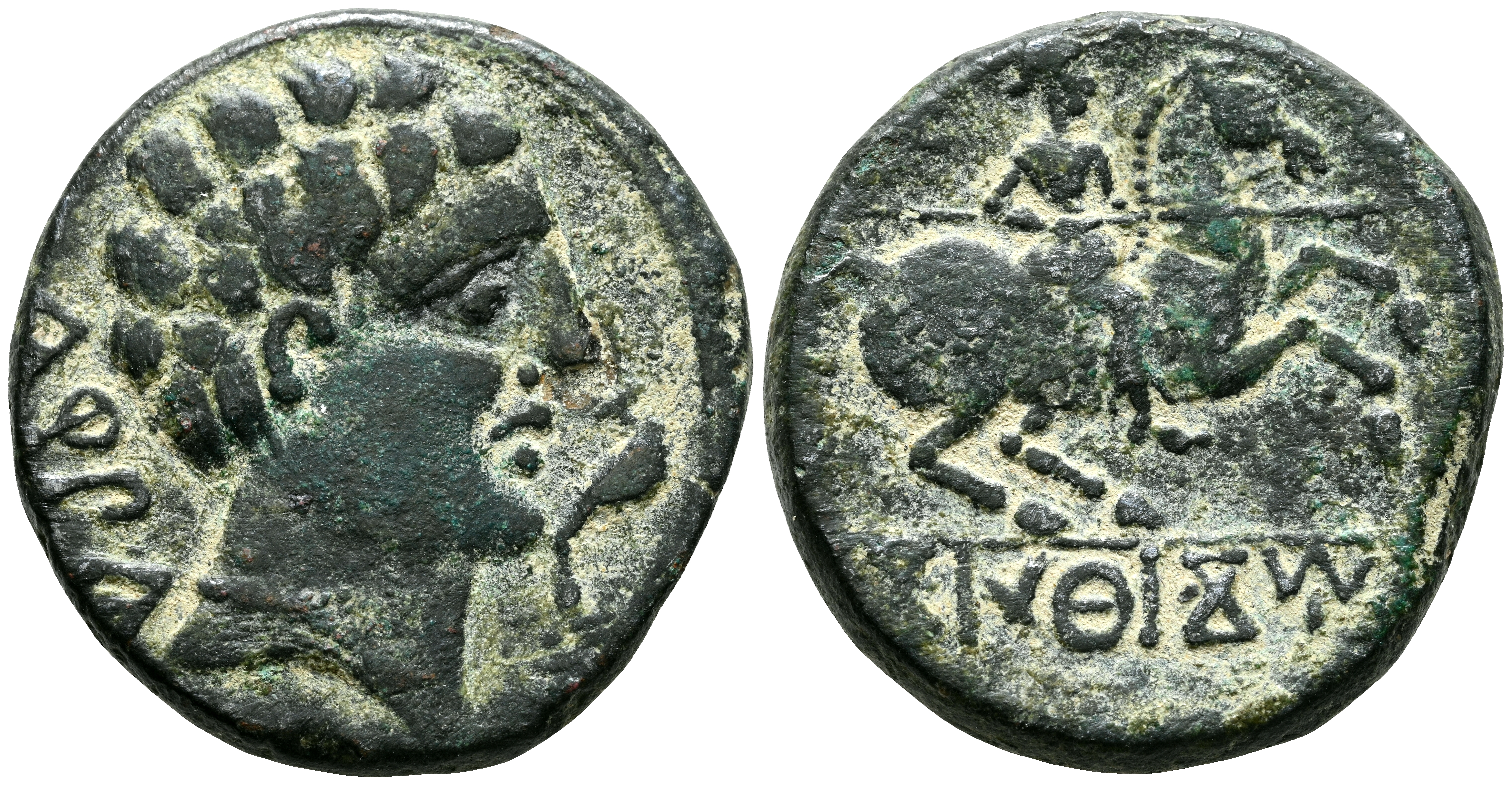 CONTERBIA CARBICA (Huete, Cuenca). As. (Ae. 9,48g/24mm). 120-80 d.C. (FAB-846). Anv: Cabeza masculina a derecha, detrás leyenda: CaRBiCa, delante delfín. Rev: Jinete con lanza a derecha, debajo leyenda ibérica bajo línea: CoNTeBaCoM. MBC.