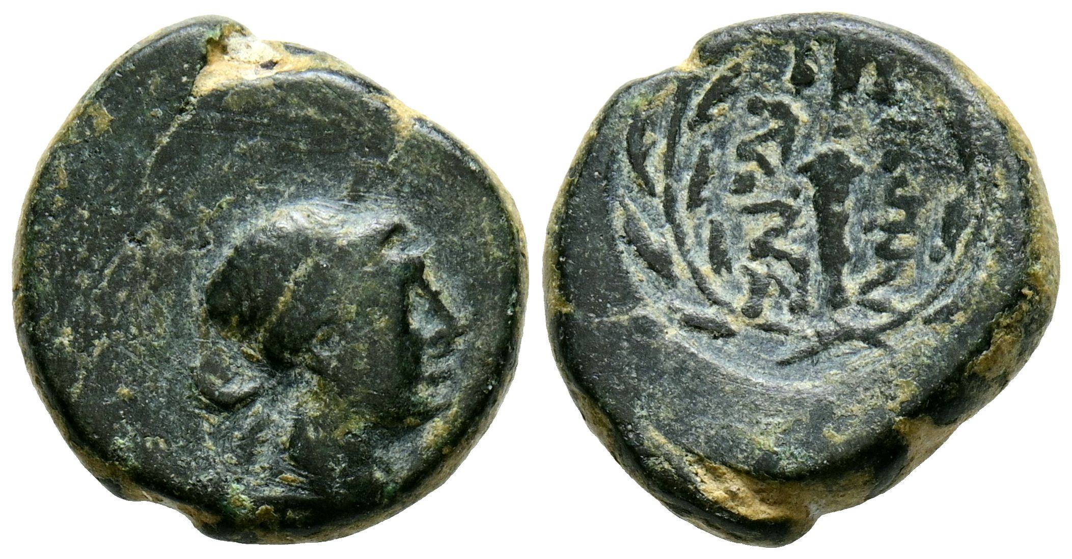 LYDIA, Sardes. Ae15. (Ae. 3,35g/15mm). 133 a.C. (GRPC Lydia 53; SNG Copenhagen 470-482). Anv: Cabeza laureada de Apolo a derecha. Rev: Mazo entre leyenda griega: ΣAΡΔI-ANΩN, todo dentro de corona de laurel. MBC.