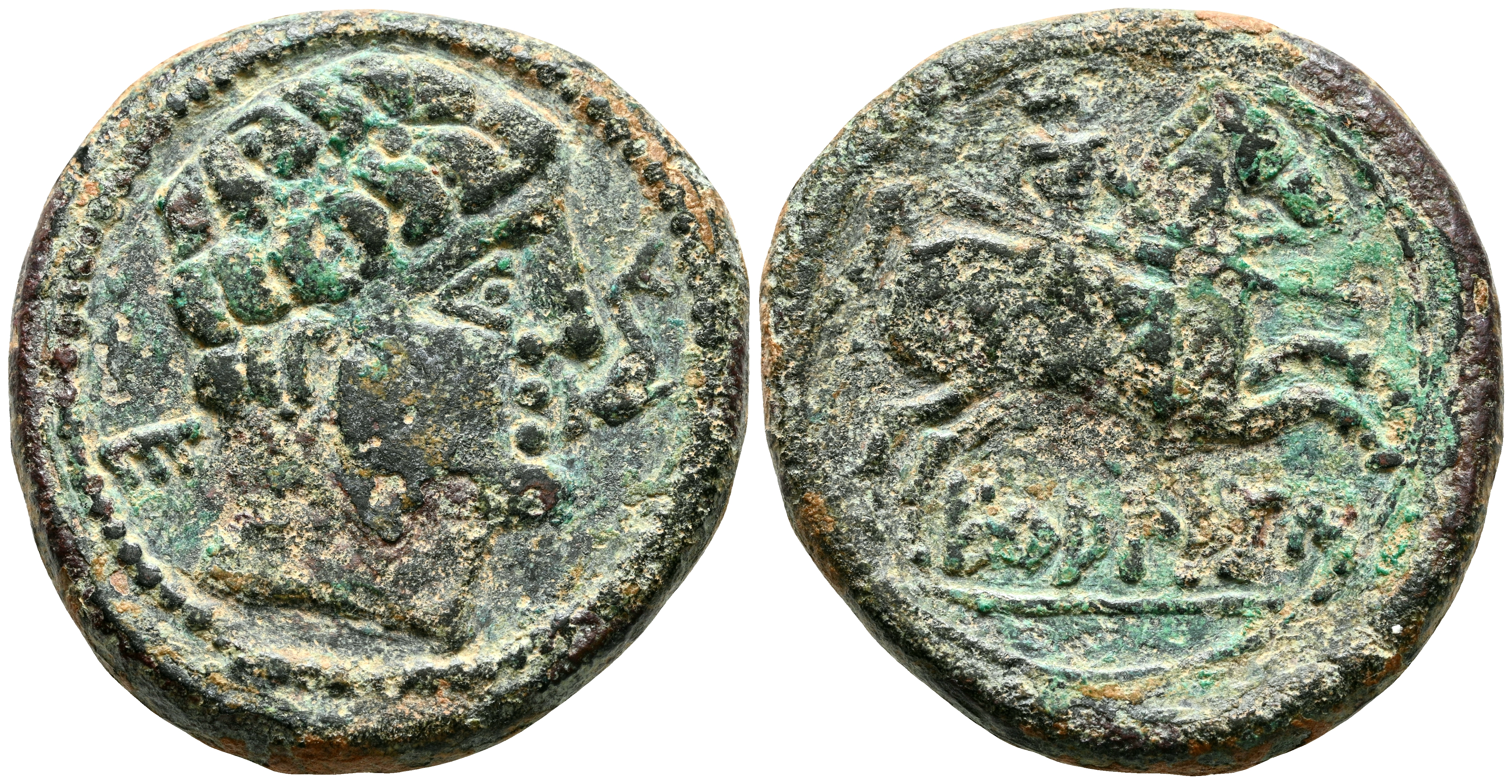 ECUALACOS (Zona de Soria-Guadalajara). As. (Ae. 11,29g/25mm). 120-20 a.C. (FAB-969). Anv: Cabeza masculina a derecha, delante delfín, detrás letra ibérica: E. Rev: Jinete con lanza a derecha, debajo leyenda: ECuALACoS. MBC.