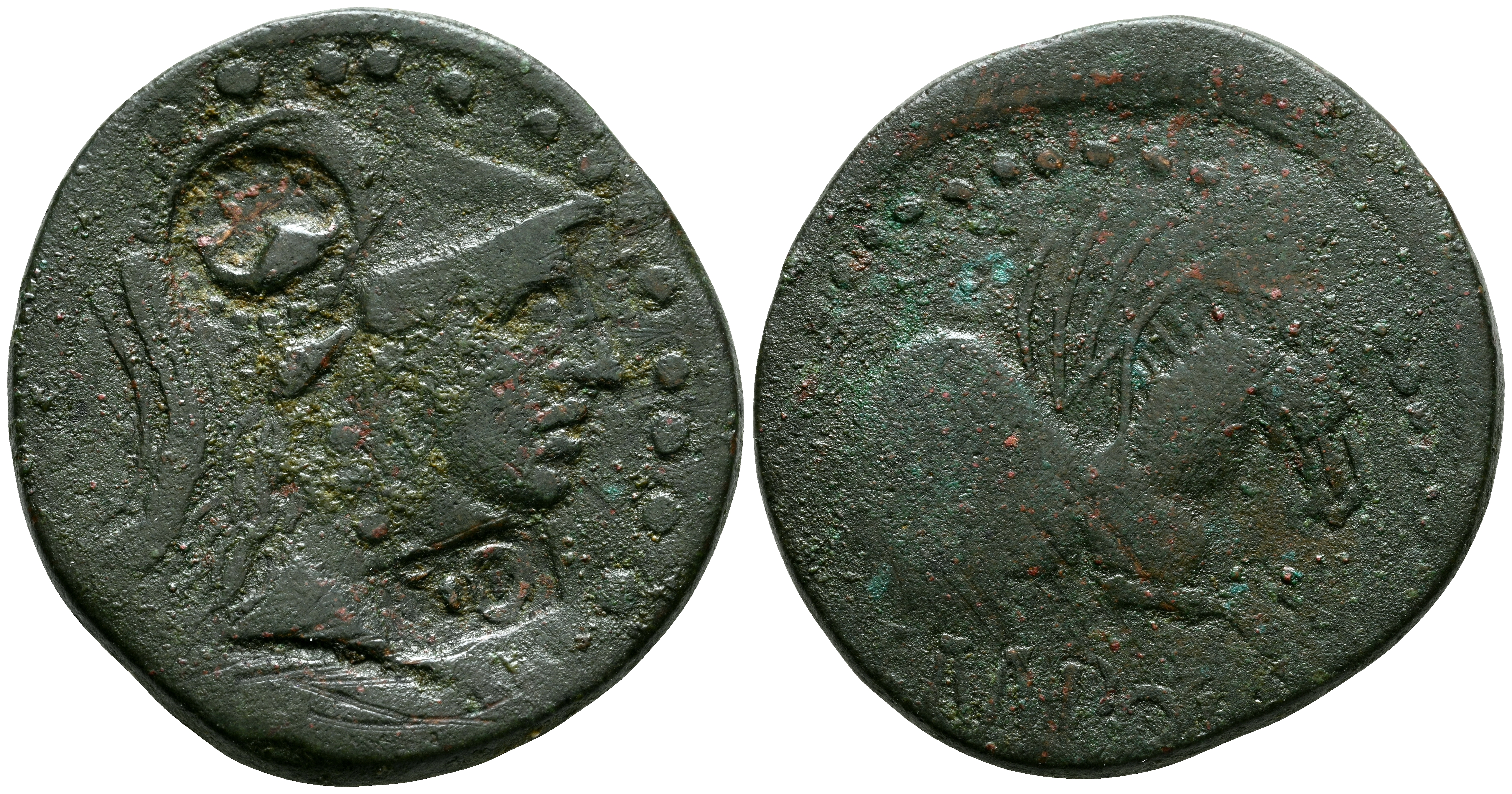 EMPORION (Ampurias, Gerona). As. (Ae. 10,23g/26mm). 50-27 a.C. (FAB-1246). Anv: Cabeza de Palas con casco a derecha. Rev: Pegaso a derecha, encima corona de laurel, debajo leyenda: EMPORI. MBC-. En anverso, resellos: Delfín y DD.