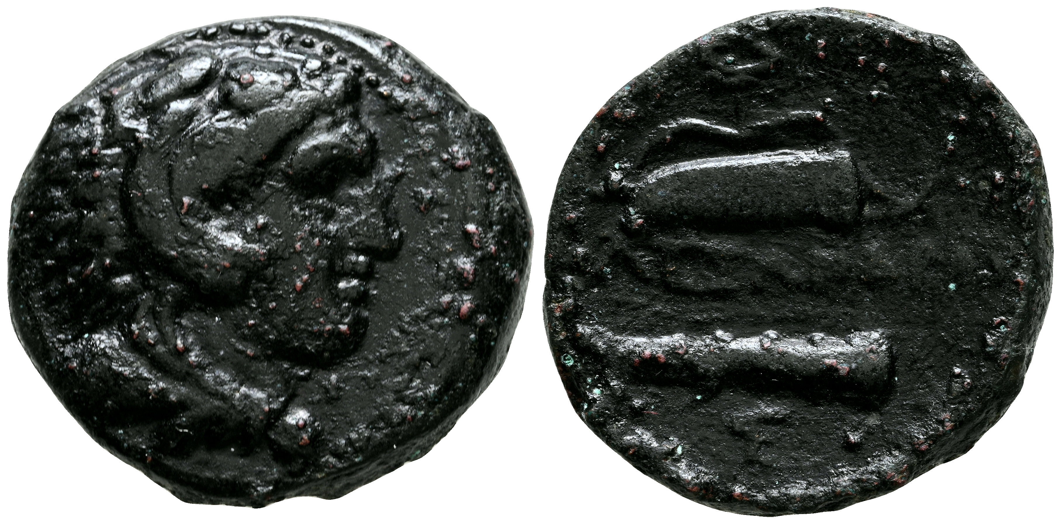 REYES DE MACEDONIA, Alejandro III el Grande. Ae19. (Ae. 5,59g/19mm). 336-323 d.C. Ceca incierta. (Price 266; HGC 3.1, 925a). Anv: Cabeza de Hércules con piel de león a derecha. Rev: Leyenda griega: AΛΕΞΑΝΔΡOY, entre arco con carcaj y mazo. MBC.