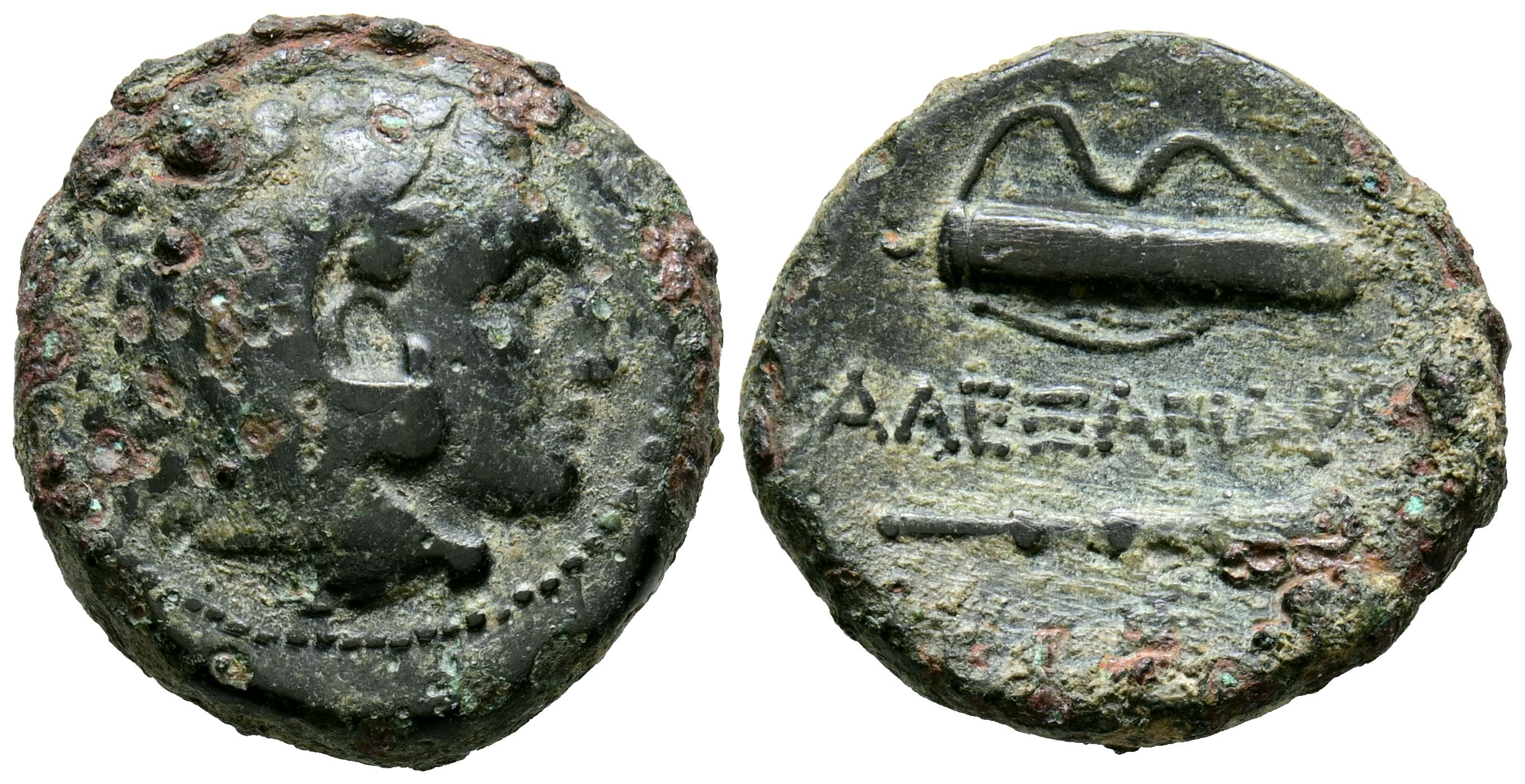 REYES DE MACEDONIA, Alejandro III el Grande. Ae20. (Ae. 5,57g/20mm). 336-323 a.C. Ceca incierta. (Price 266; HGC 3.1, 925a). Anv: Cabeza de Hércules con piel de león a derecha. Rev: Leyenda griega: AΛΕΞΑΝΔΡOY, entre mazo y arco con carcaj. MBC. Oxida ciones.