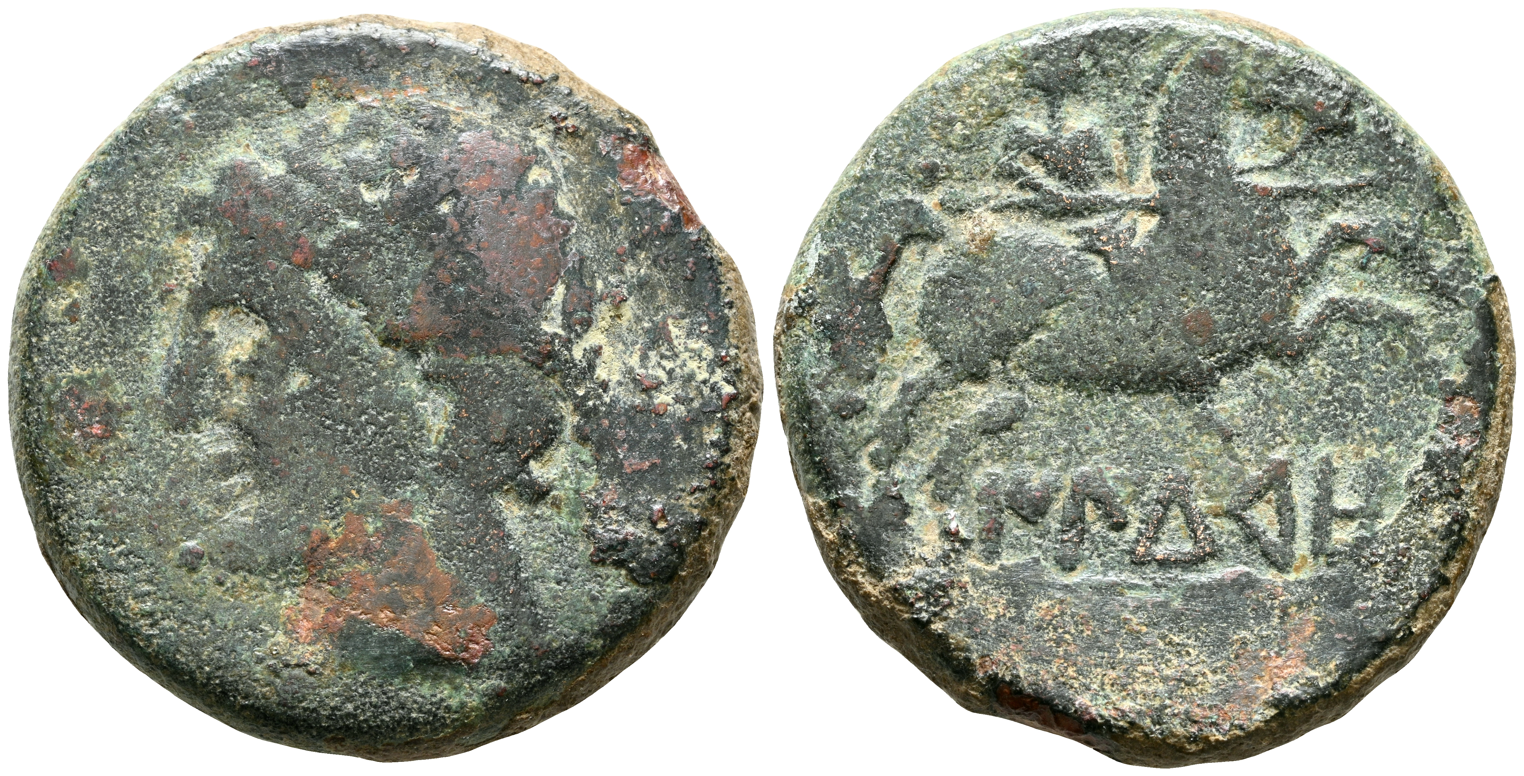 ILDURO (Mataró, Barcelona). As. (Ae. 11,40g/25mm). 120-20 a.C. (FAB-1442). Anv: Cabeza laureada masculina a izquierda. Rev: Jinete con lanza a derecha, debajo leyenda ibérica: ILDuRO. MBC-.