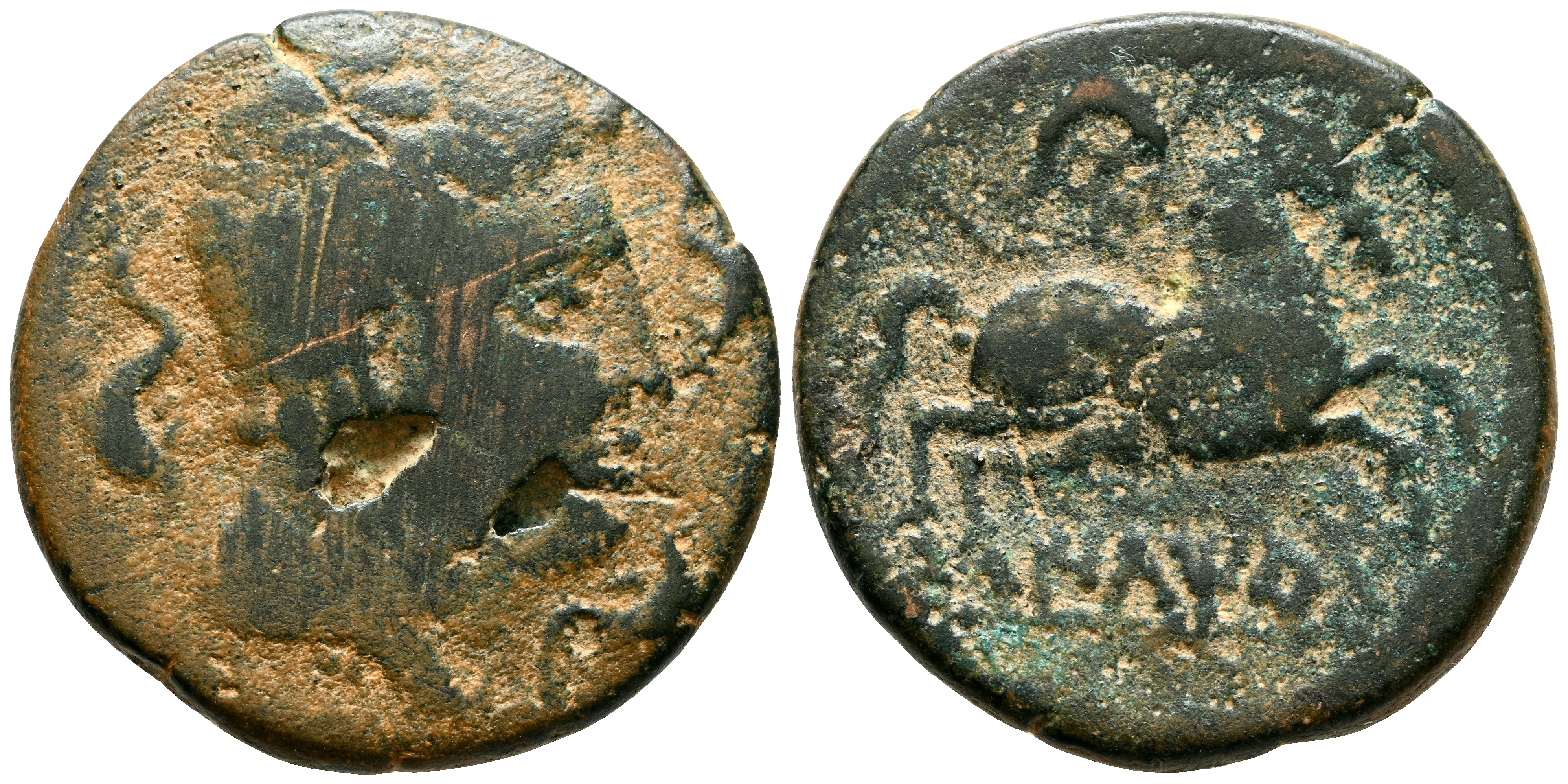 ILTIRTA (Lleida). Semis. (Ae. 6,38g/20mm). 220-200 a.C. (FAB-1467). Cabeza masculina a la derecha rodeada por tres delfines. Rev: Caballo a derecha, encima media luna, debajo sobre línea leyenda ibérica: ILTiRTa. MBC-. Oquedades en anverso.