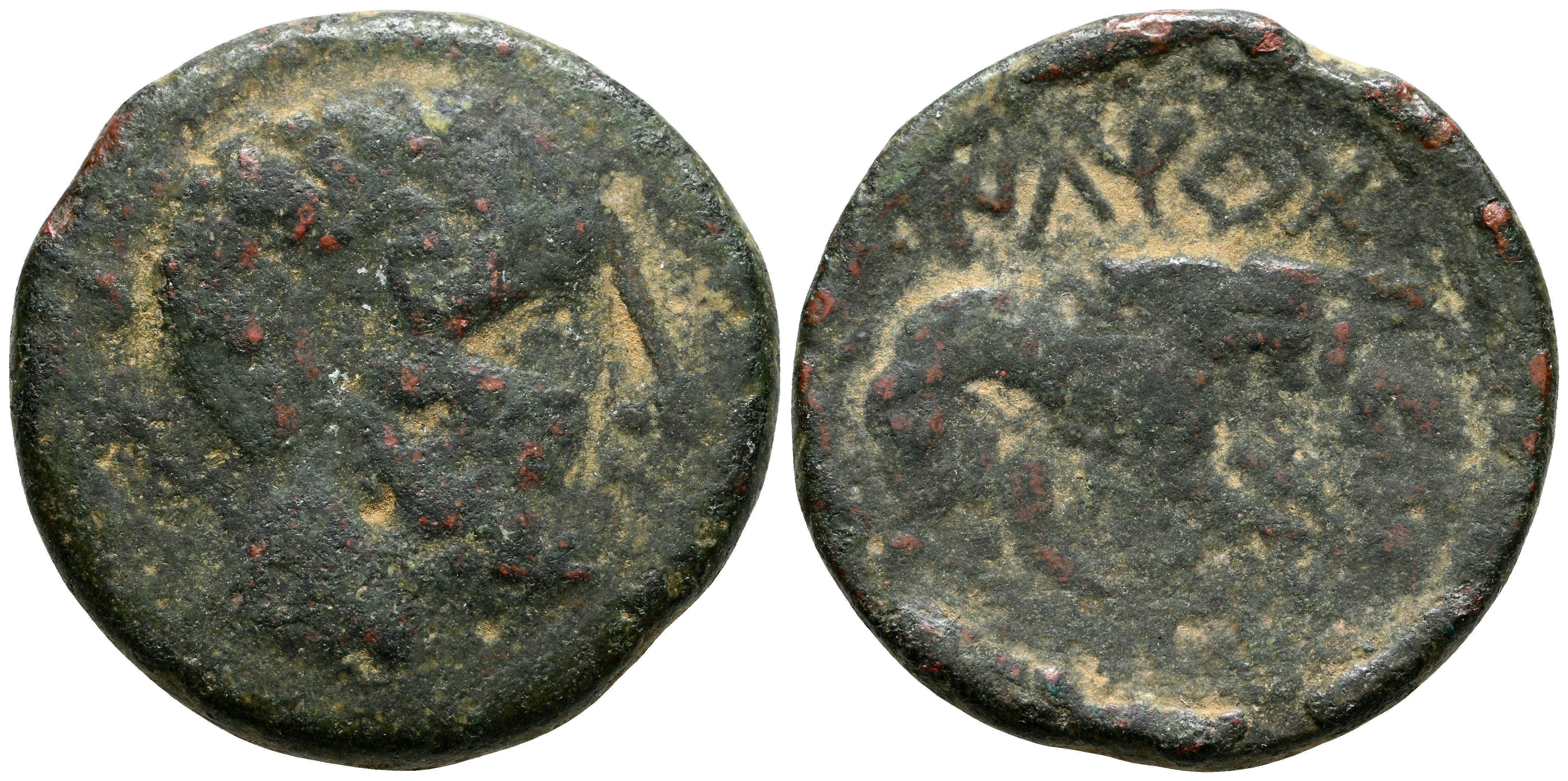 ILTIRTA (Lleida, Cataluña). As. (Ae. 6,85g/22mm). 200-20 a.C. (FAB-1476). Anv: Cabeza masculina a derecha. Rev: Lobo saltando a derecha, encima ILTiRTa. BC.