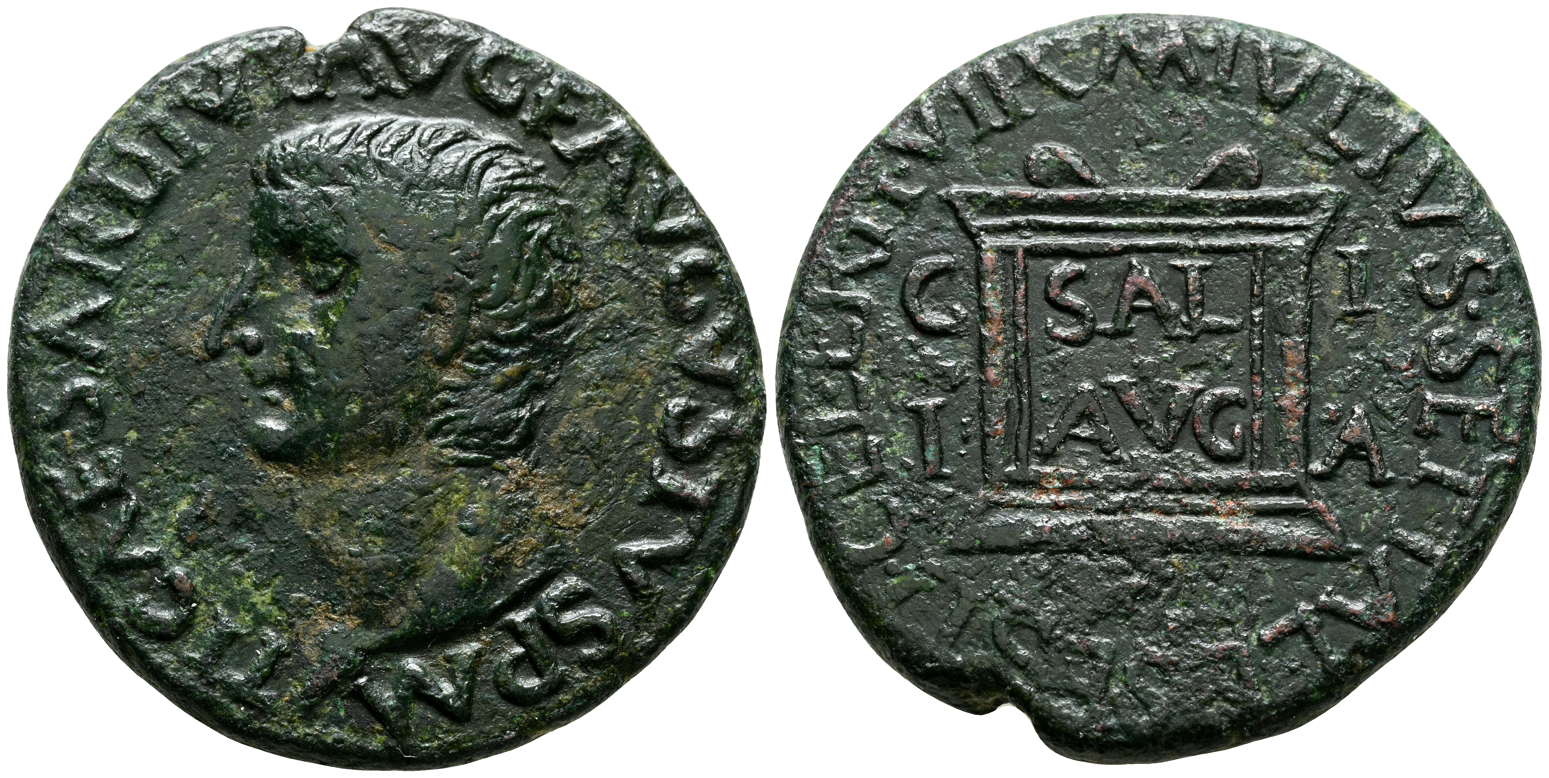 ILICI (Elche, Alicante). As. (Ae. 12,73g/27mm). 14-36 d.C. (FAB-1522). Anv: Cabeza de Tiberio a izquierda, alrededor leyenda: TI CAESAR DIVI AVG F AVGVTVS P M. Rev: Altar, en su interior: SAL/AVG, alrededor leyenda: M IVLIVS SETIAL L SESTI CELER II VIR. MBC.