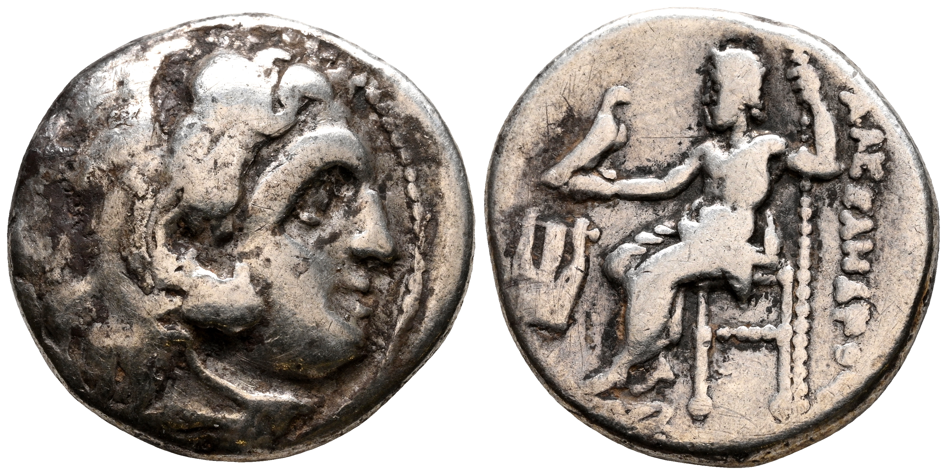 REYES DE MACEDONIA, Alejandro III el Grande. Dracma. (Ar. 4,17g/16mm). 336-323 a.C. Kolophon. (Price 1768). Anv: Cabeza de Heracles con piel de león a derecha. Rev: Zeus sentado a izquierda portando cetro y águila, delante arpa, detrás leyenda griega : ΑΛΕΞΑΝΔΡΟΥ. MBC.